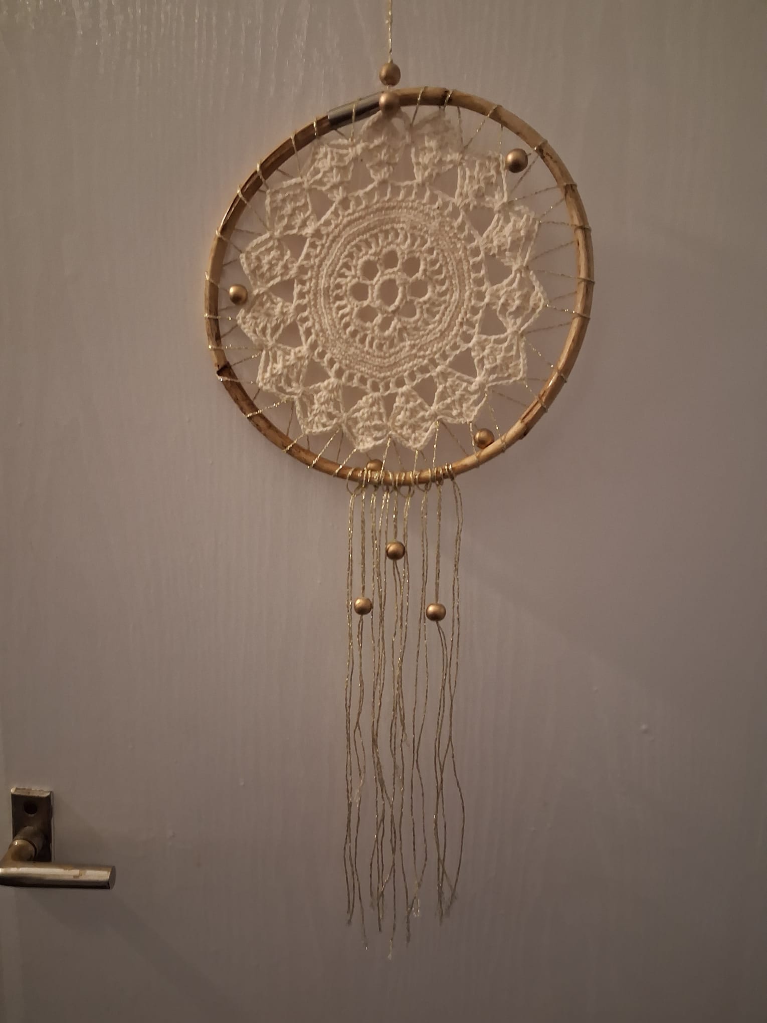 Virkattu puuvillalangasta, pingotettu rottinkikehykseen, oma tuunattu malli. Puiset helmet. Ripustuslangan pituus 47,5 cm, koristeen pituus 45 cm, ⌀ 20 cm.