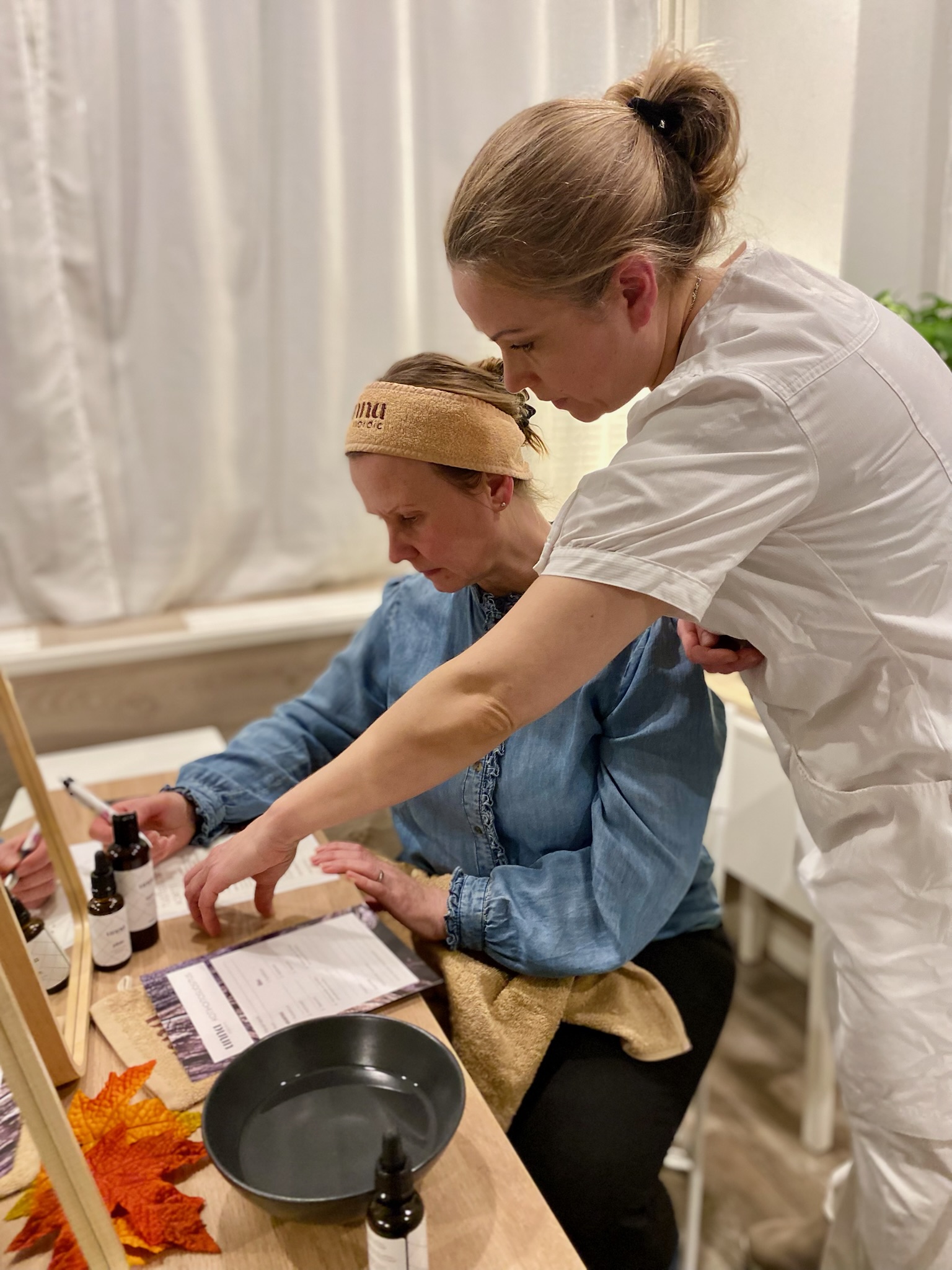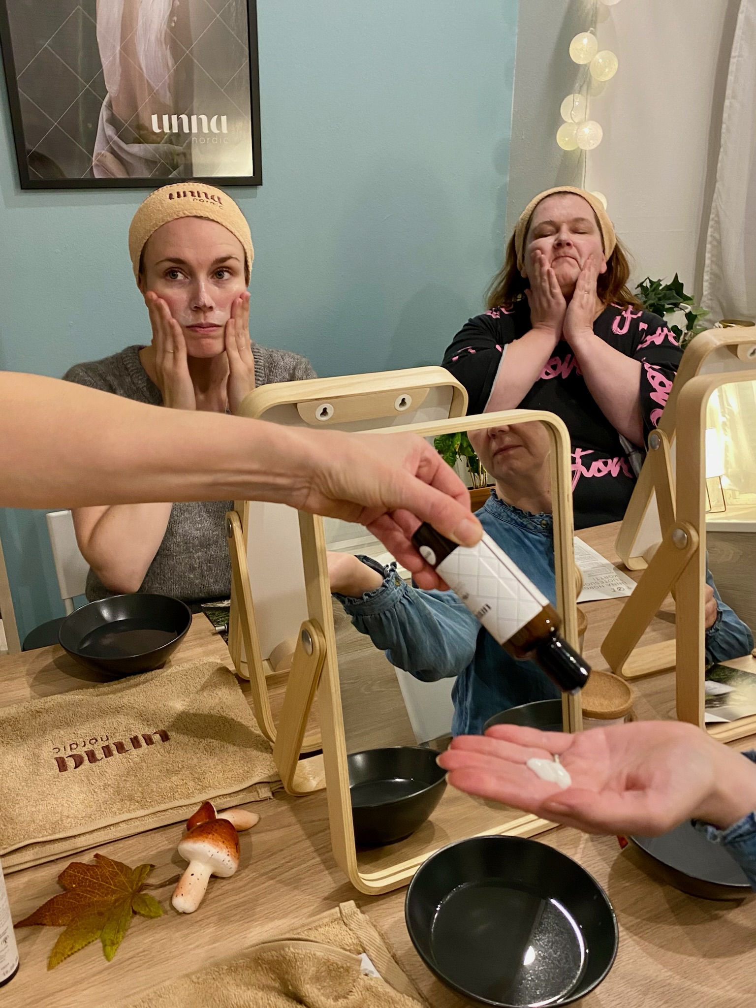 Tämän jälkeen jokainen tekee oman Unna Nordic Ritual -kasvohoidon oman pisteensä äärellä. Peili, päääpanta, kasvokulho ja tuotteet odottavat. Kosmetologi auttaa sinua valitsemaan juuri sinun ihollesi sopivat tuotteet ja opastaa hierontaliikkeet vaihe vaiheelta.