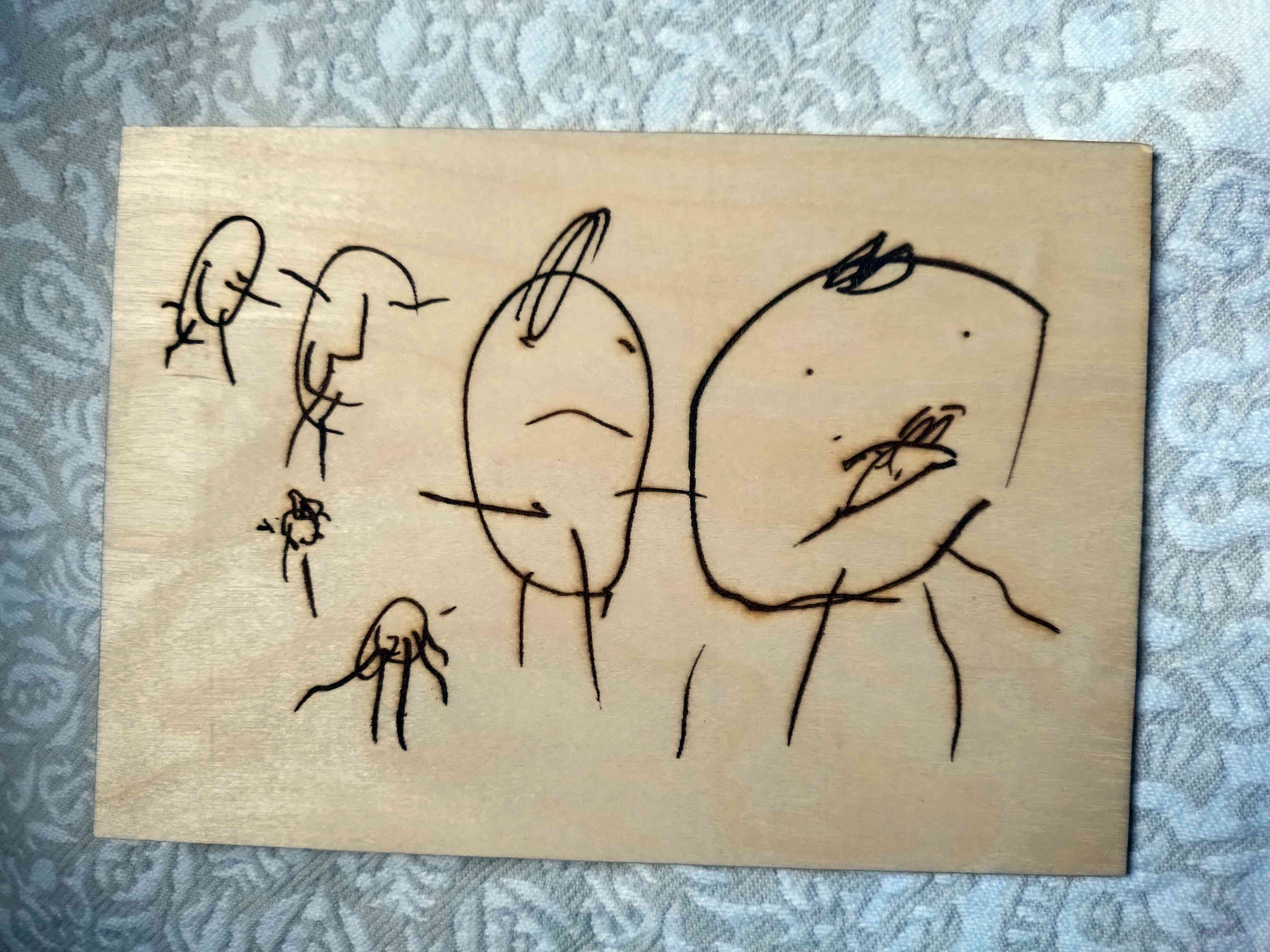 Täydellinen lahja äidille, isälle mummolle tai vaarille jne. Ikuista lapsen piirustus suomalaiseen koivuvaneriin. Peruskoko noin 130 x 185mm, isompikin onnistuu (MAX koko A4).