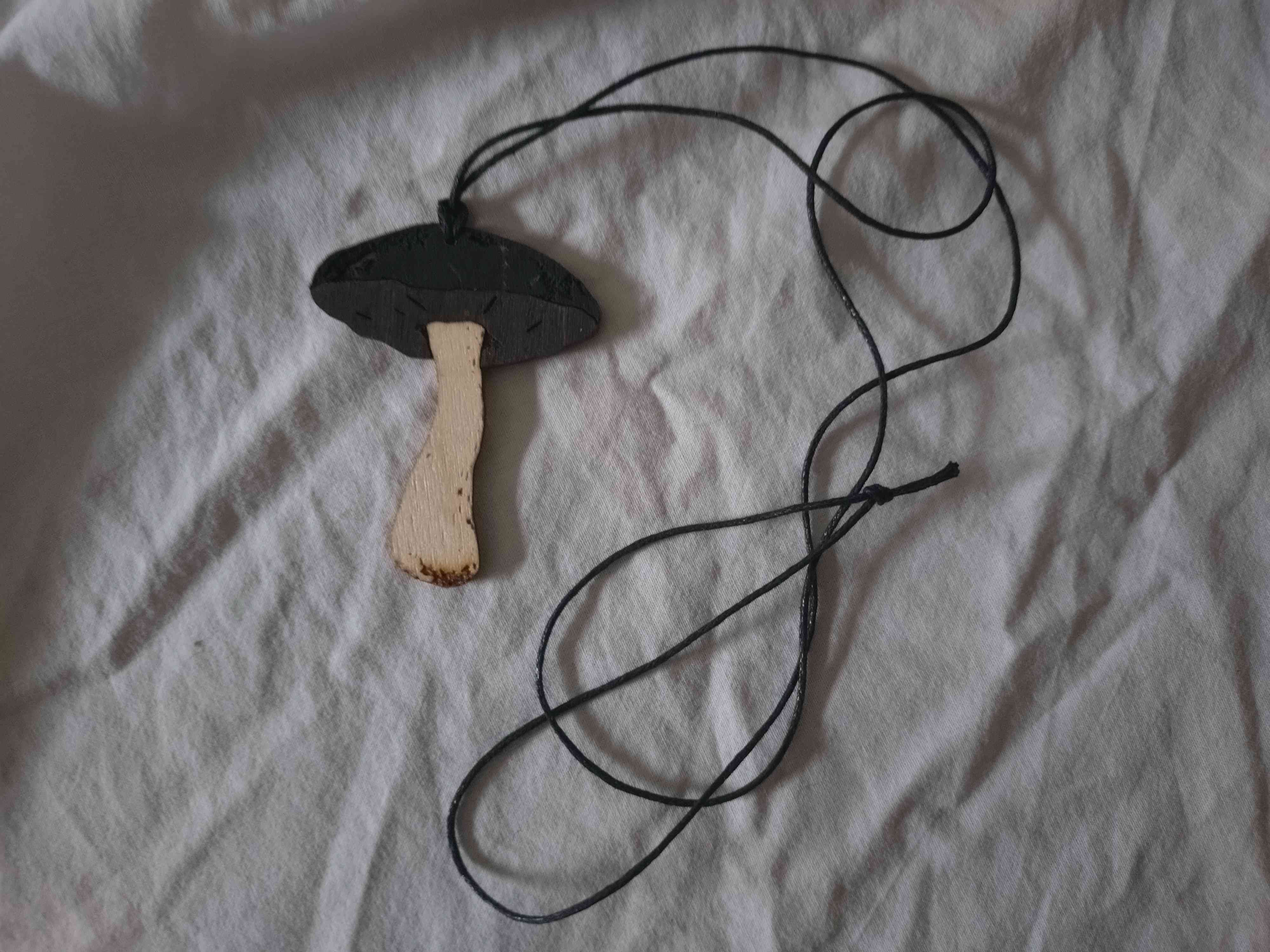 Sieni kaulakoru, koivuvanerinen. Mitat: n. 45 x 55mm. POSTITUSMAKSU: 5,90 € lisätään loppusummaan kassalla.