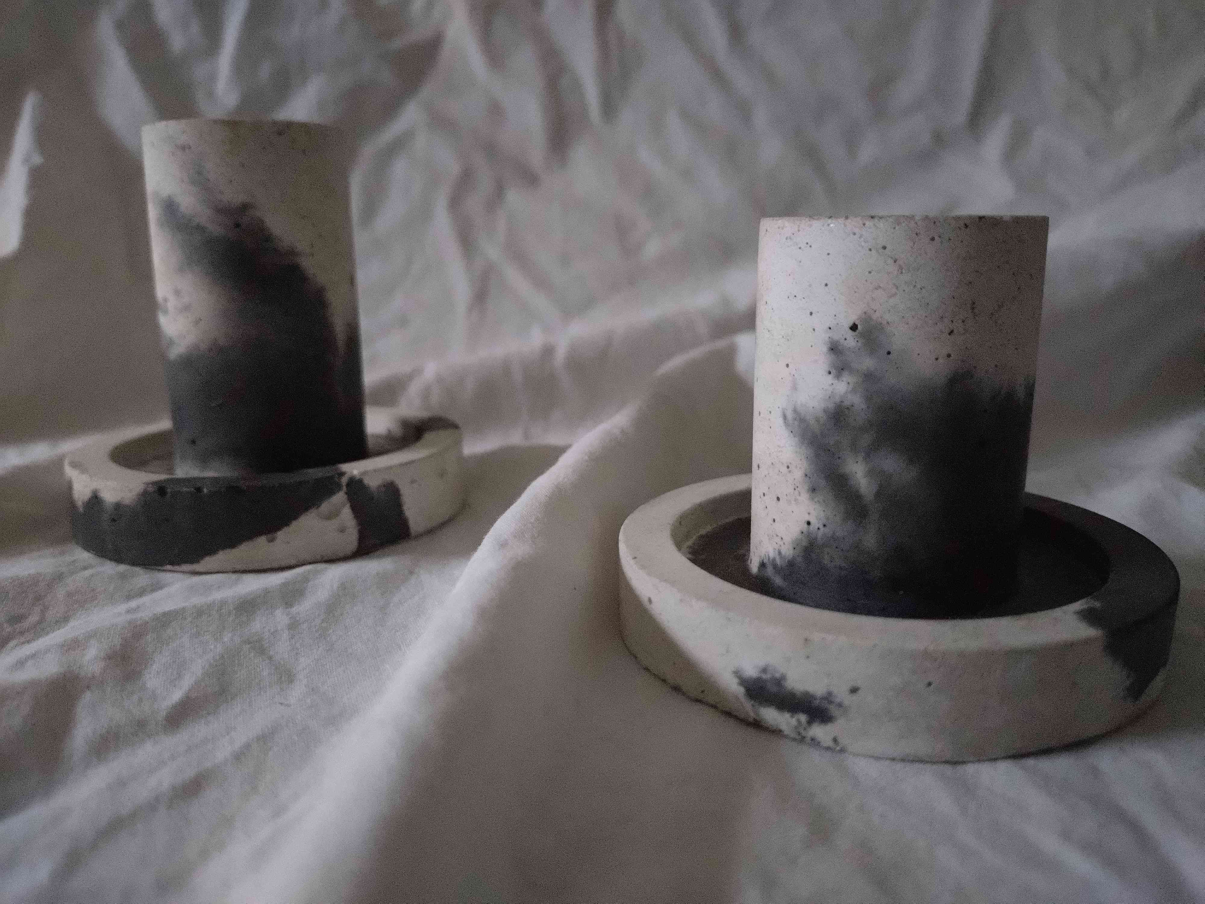 Valkobetoniset ja liukuvärjätyt kynttilänjalat, iso + pieni. Mitat: iso 72 x 72 mm, pieni 72 x 60mm. POSTITUSMAKSU: 5,90 € lisätään loppusummaan kassalla.