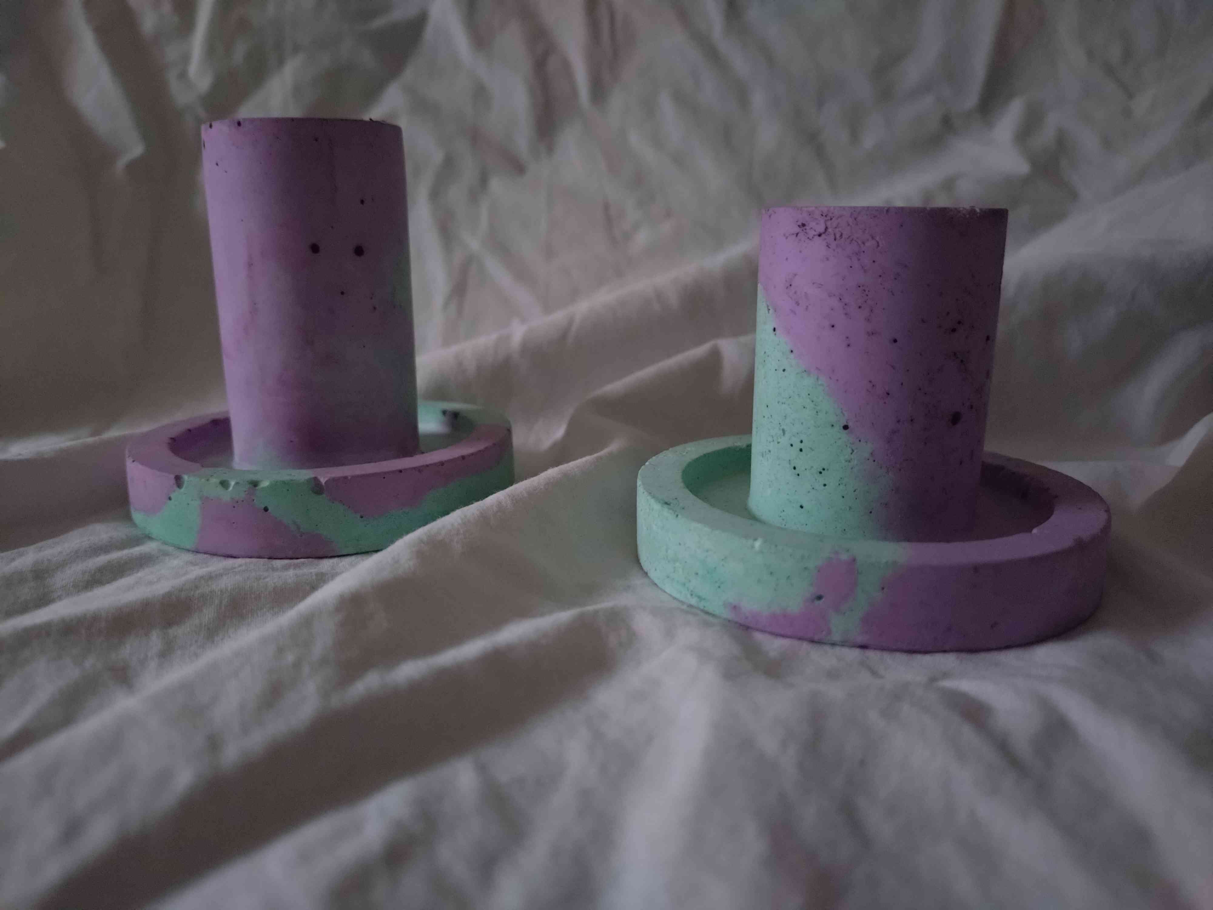 Valkobetoniset ja liukuvärjätyt kynttilänjalat, iso + pieni. Mitat: iso 72 x 72 mm, pieni 72 x 60mm. POSTITUSMAKSU: 5,90 € lisätään loppusummaan kassalla.