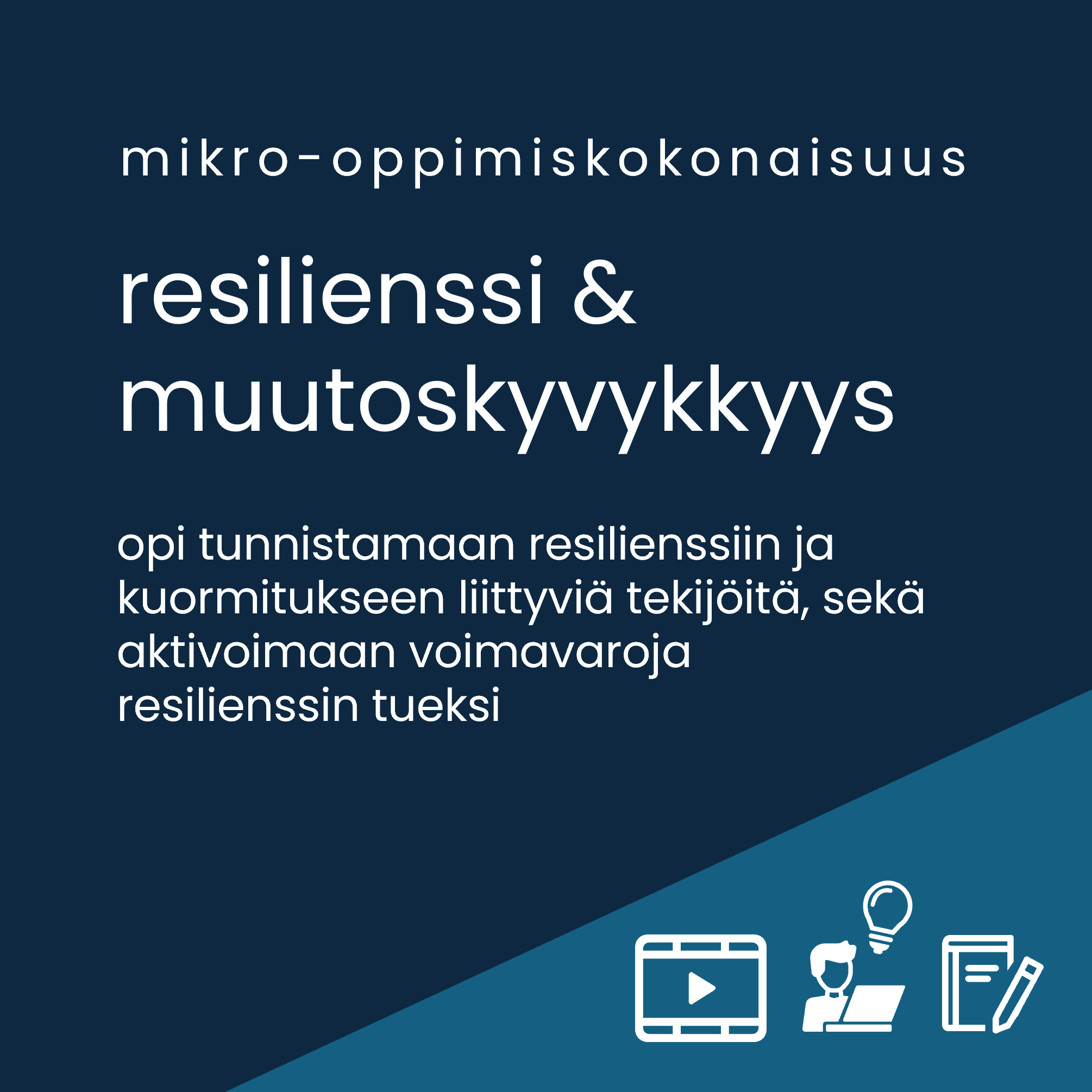 Resilienssi on käyttäytymistä, ajattelua ja asennoitumista, jota jokainen voi oppia sekä vahvistaa. Tämän työkalupakin avulla opetellaan tunnistamaan resilienssiin ja kuormitukseen liittyviä tekijöitä, sekä aktivoimaan voimavaroja resilienssin tueksi. Kokonaisuus tarjoaa näkökulmia ja pohdintoja resilienssitaitojen tarkasteluun sekä kehittämiseen. Se sisältää myös esimerkkejä mikromuutoksista, joita voi hyödyntää pienien muutoksien viemisessä arkeen.