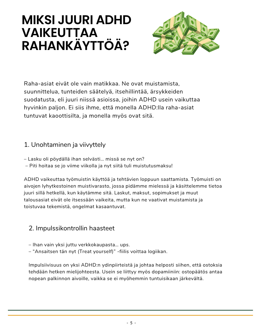 Unohtuiko lasku? Kävikö lähimaksu vähän liian tiuhaan? Tuntuuko, että raha-asiat on vaan... kaaosta? Et ole yksin – ja et todellakaan ole huono rahan kanssa. Sinulla on ADHD, ja se vaikuttaa siihen, miten suhtaudut rahaan, päätöksiin ja arjen hallintaan.