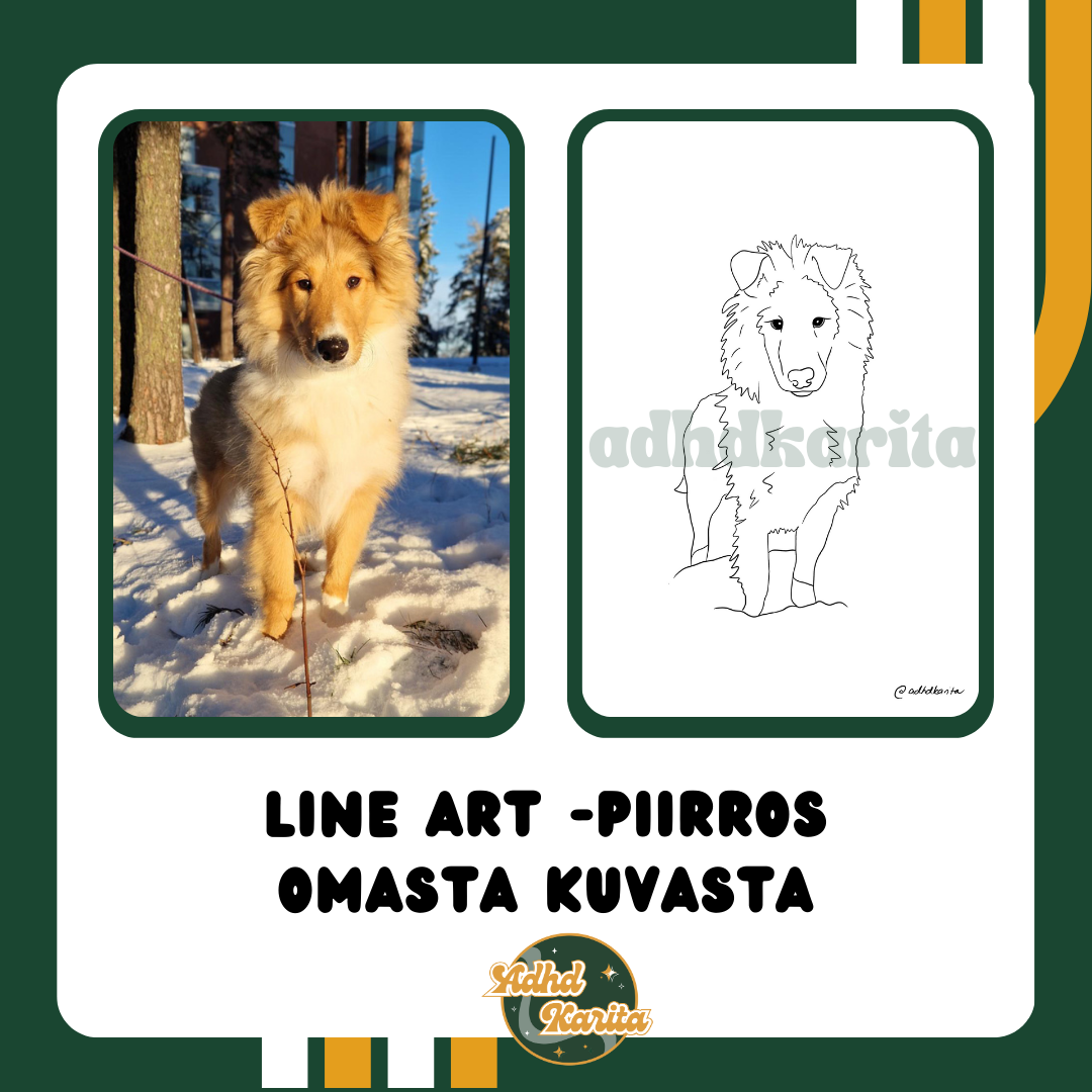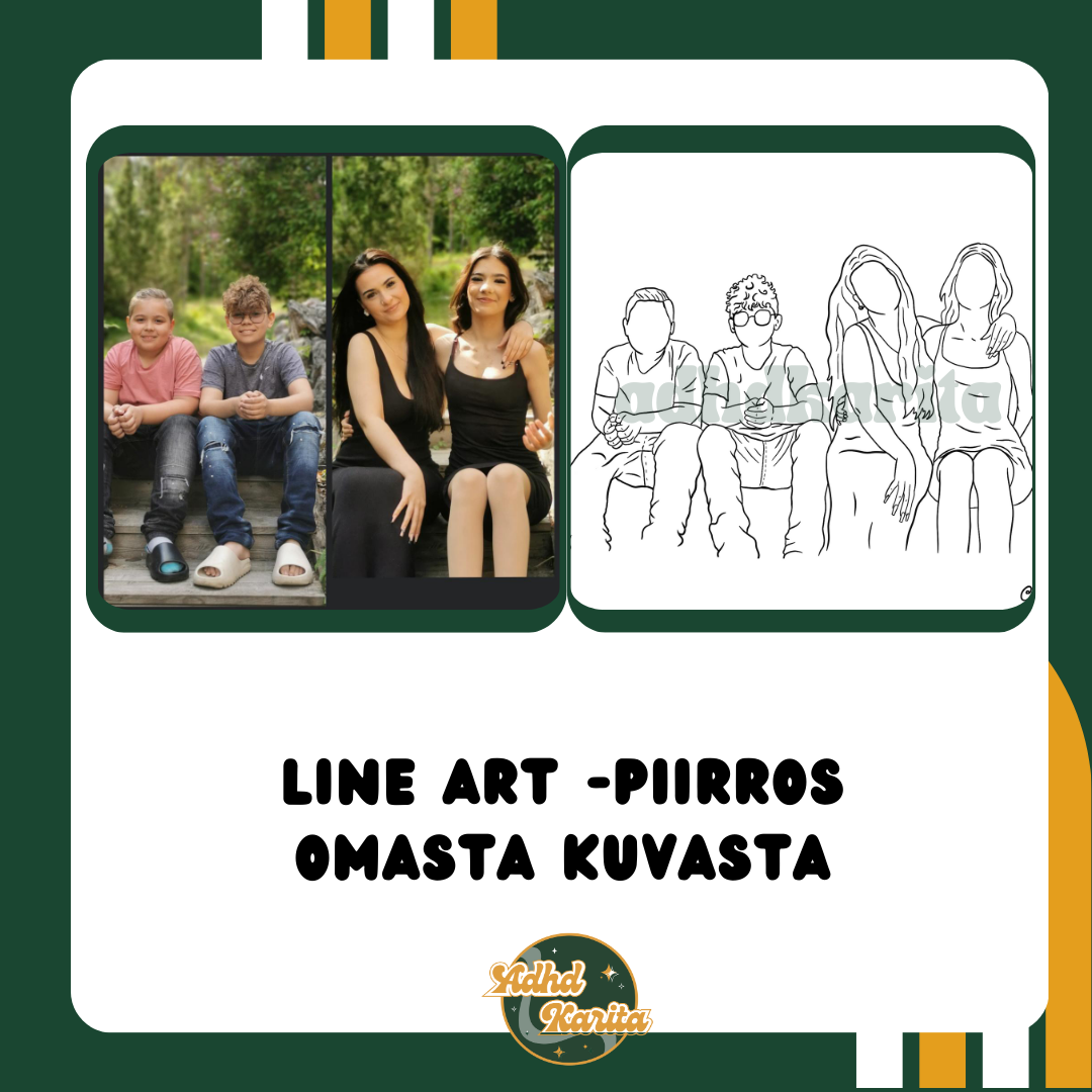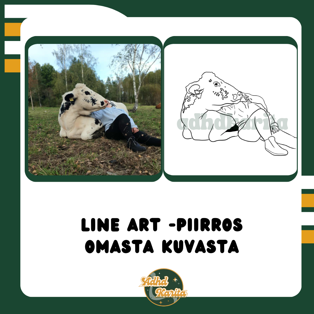 Line art -piirrostyö omasta valokuvasta! Line art on ääriviivat ja näkyvimmät piirteet huomioon ottava taideteos, joka piirretään omasta kuvastasi. Ikuista itsesi ja läheisesi, rakas lemmikkisi, ensiautosi tai vaikka harrastusvälineesi taiteeksi, joka kestää aikaa! Huomaathan, että tuote on digitaalisessa PNG-tiedostomuodossa.