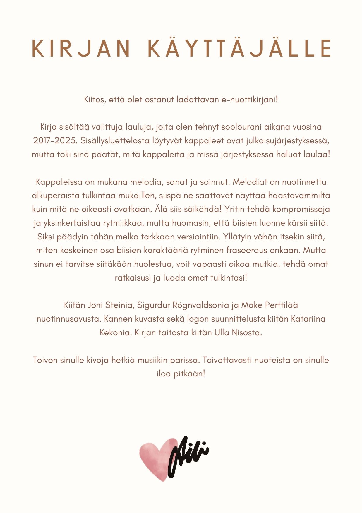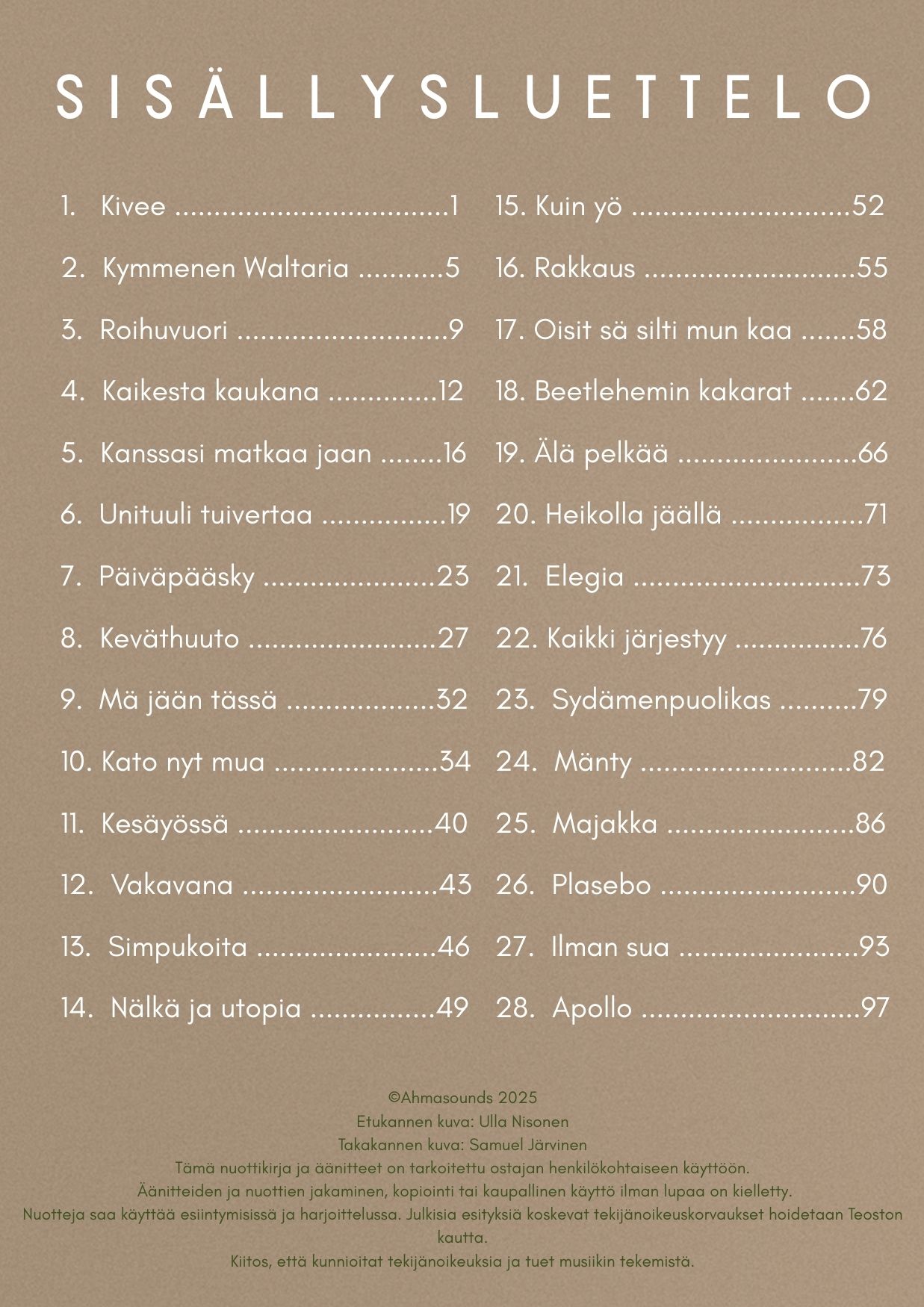 Nuottikirja sisältää lead sheet -nuotit 28 säveltämääni kappaleeseen. Oston yhteydessä saat myös äänitteet, jotka ovat ladattavissa tilausvahvistussähköpostissa olevasta Dropbox-linkistä.
