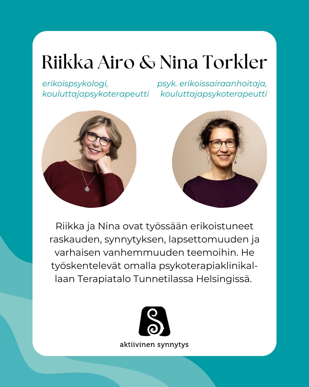 Riikka ja Nina ovat työssään erikoistuneet raskauden, synnytyksen, lapsettomuuden ja varhaisen vanhemmuuden teemoihin. He työskentelevät omalla psykoterapiaklinikallaan Terapiatalo Tunnetilassa Helsingissä.
