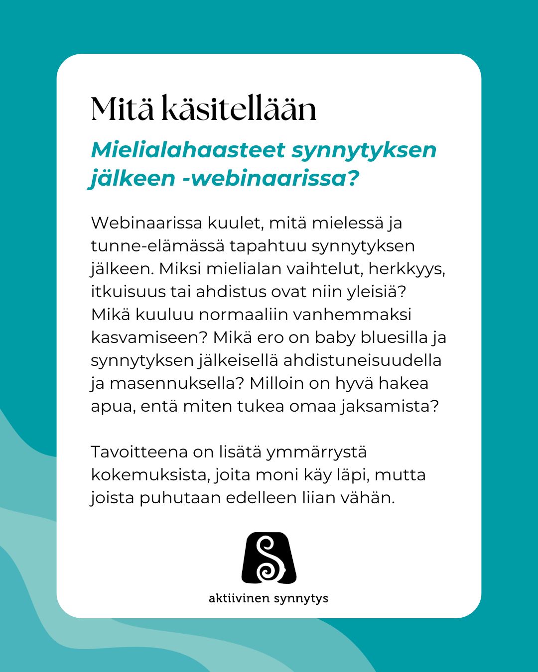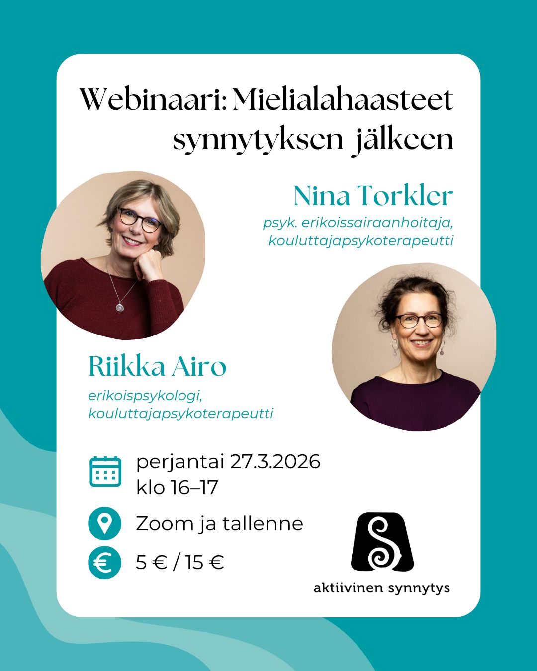 Tule 27.3.2026 kello 16 - 17 mukaan kuuntelemaan kun Riikka Airon, erikoispsykologi, kouluttajapsykoterapeutti ja Nina Torklerin, psyk. erikoissairaanhoitaja, kouluttajapsykoterapeutti, kanssa keskustellaan, mitä mielessä ja tunne-elämässä tapahtuu synnytyksen jälkeen. Miksi mielialan vaihtelut, herkkyys, itkuisuus tai ahdistus ovat niin yleisiä? Mikä kuuluu normaaliin vanhemmaksi kasvamiseen? Mikä ero on baby bluesilla ja synnytyksen jälkeisellä ahdistuneisuudella ja masennuksella? Milloin on hyvä hakea apua, entä miten tukea omaa jaksamista?
