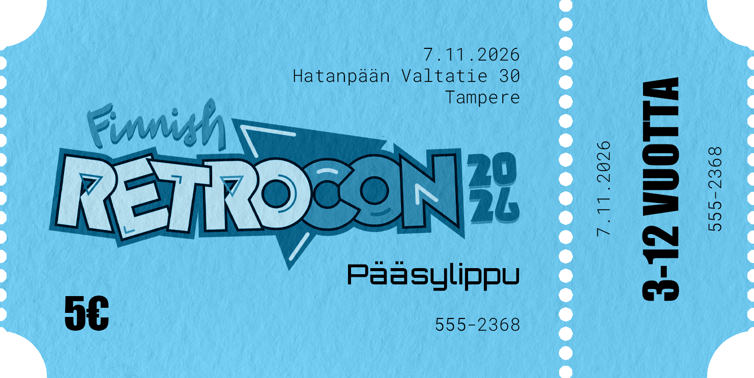 Pääsy yhdelle 3-12-vuotiaalle henkilölle vuoden 2026 Finnish Retro Con -tapahtumaan (sama hinta myös ovelta). Tapahtuman ovella varsinaisen lipun (sisäänpääsyrannekkeen) saa kuittia näyttämällä.