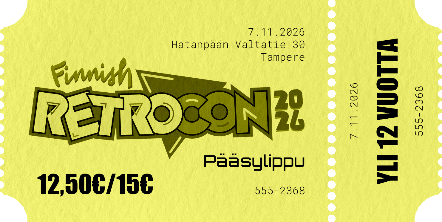 Ennakkolippu erikoishintaan, pääsy yhdelle yli 12-vuotiaalle henkilölle vuoden 2026 Finnish Retro Con -tapahtumaan. Tapahtuman ovella varsinaisen lipun (sisäänpääsyrannekkeen) saa kuittia näyttämällä.