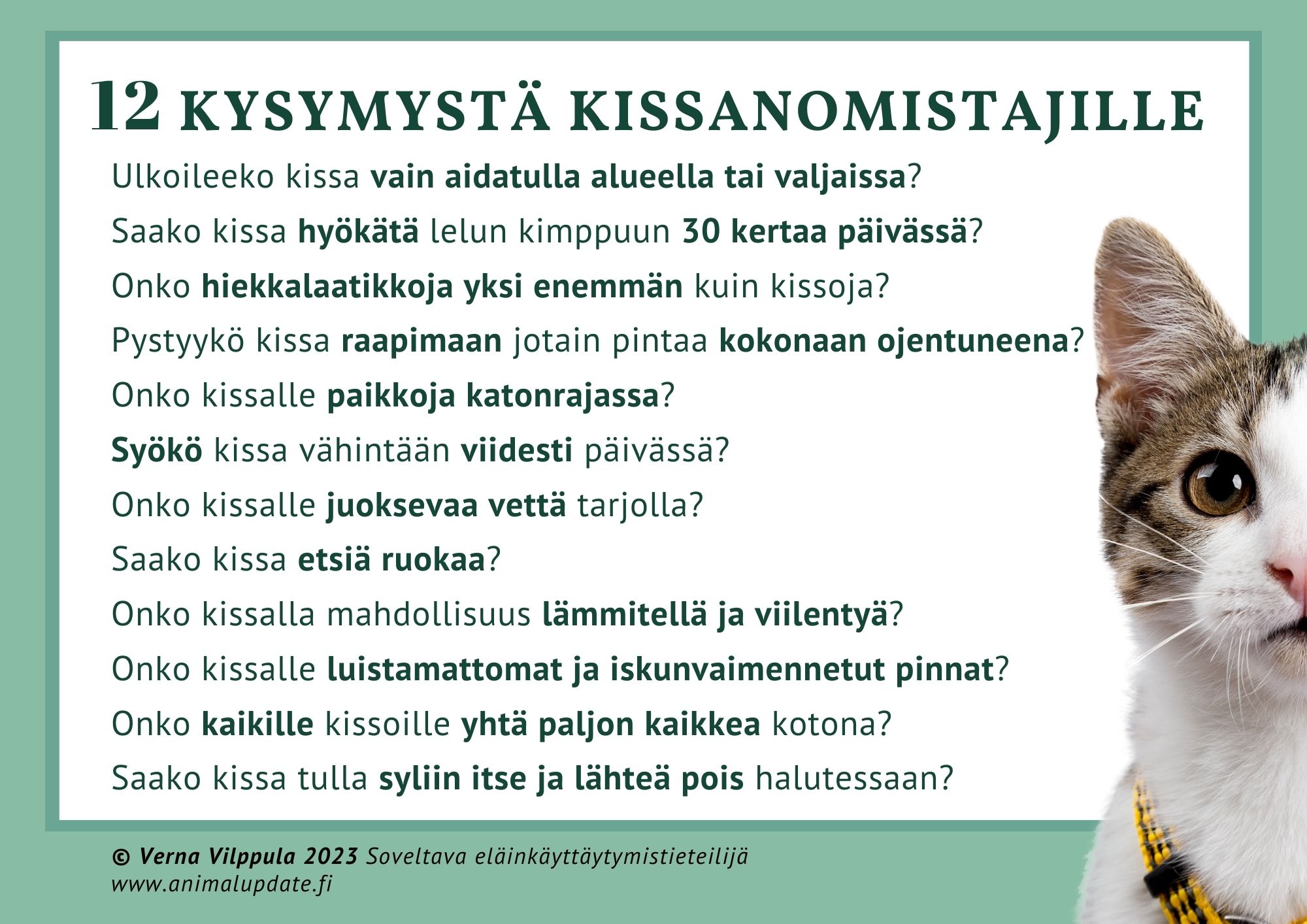 Kysymykset on suunniteltu helpottamaan eläinlääkäreiden työtä kissojen kokonaishyvinvoinnin tukemisessa.