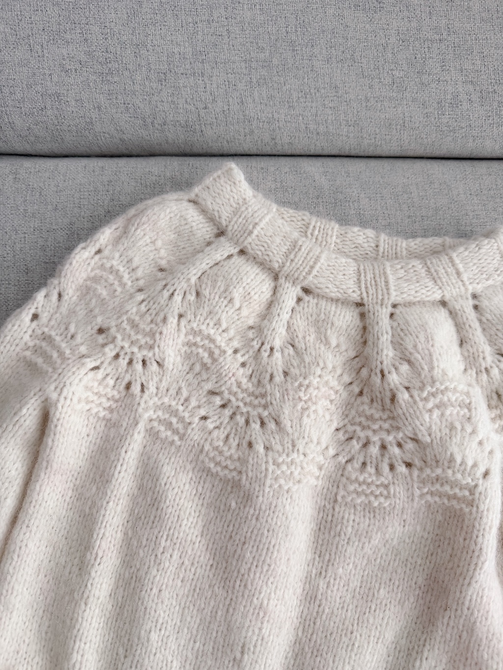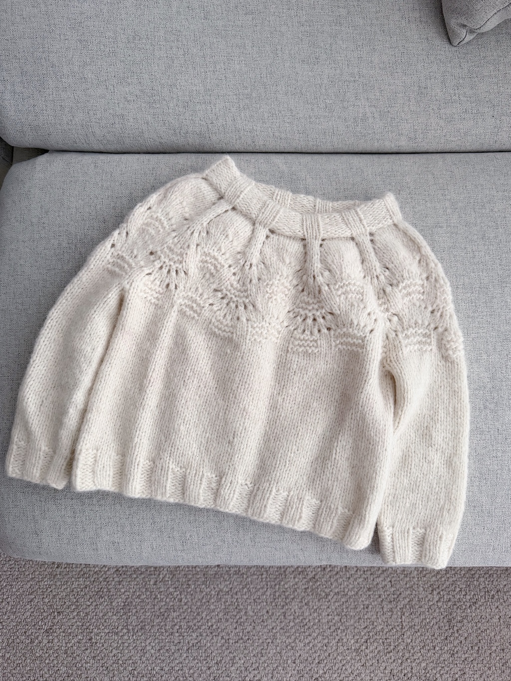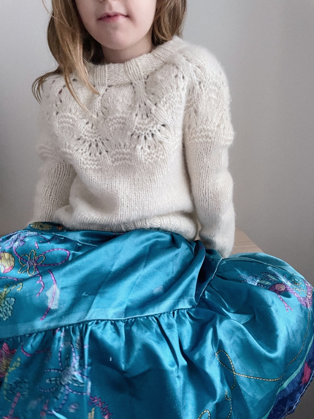 Little Lidia sweater on ylhäältä alas neulottava lasten pusero, jossa on siisti taitettu pääntie, pehmeästi laskeutuva pitsinen kaarroke ja sileällä neuleella neulottu vartalo-osa. Pusero neulotaan saumattomasti suljettuna neuleena ja viimeistellään kauniilla resoreilla. Ihana, kevyt ja lämmin lasten neule kauniilla kaarrokkeella.