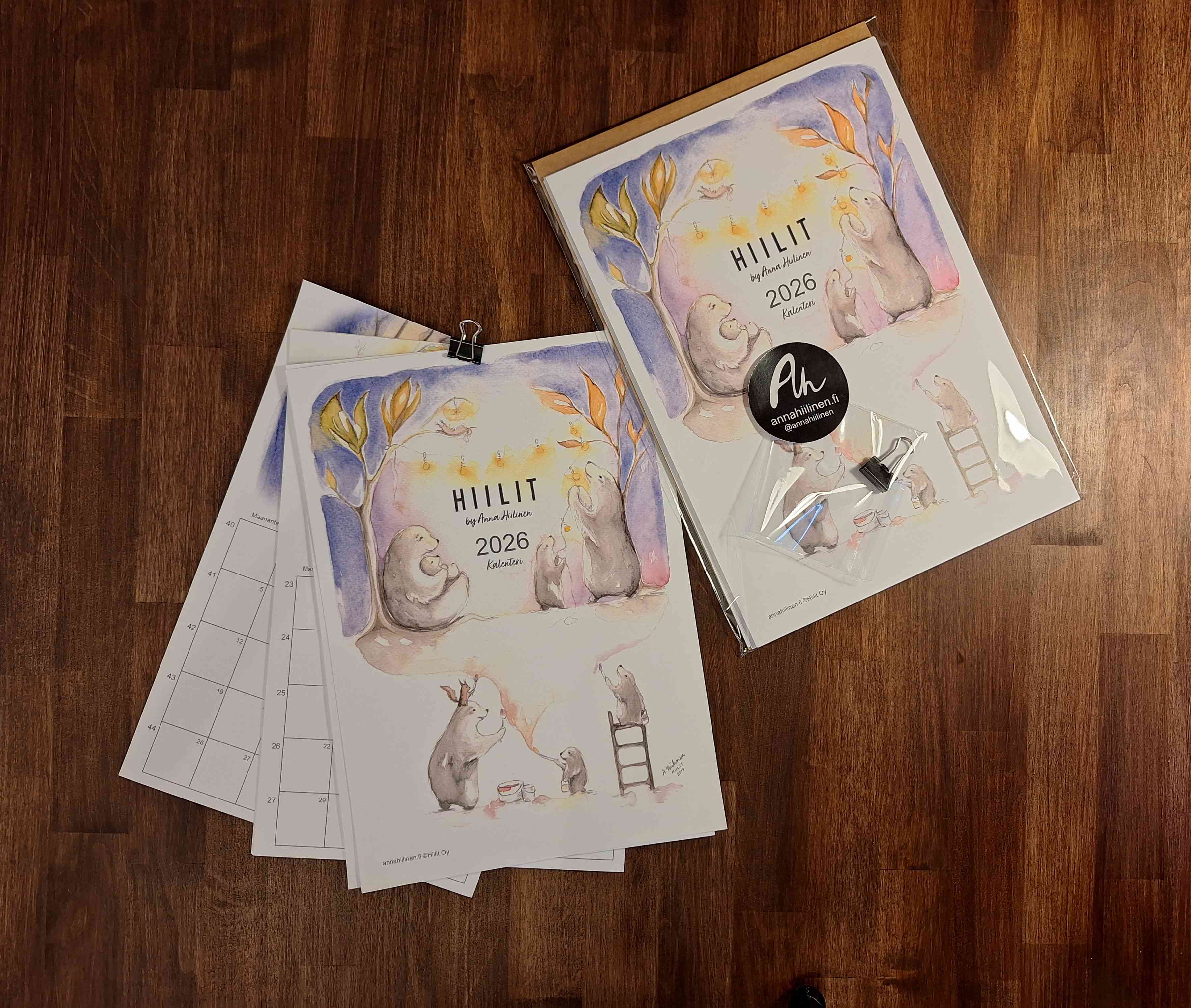 Seinäkalenteri vuodelle 2026. A4-kokoinen kalenteri, jonka kuvituksissa seikkailee HIILIT-olennot. Kuvitus ja suunnittelu Anna Hiilinen. Copyright Hiilit Oy.