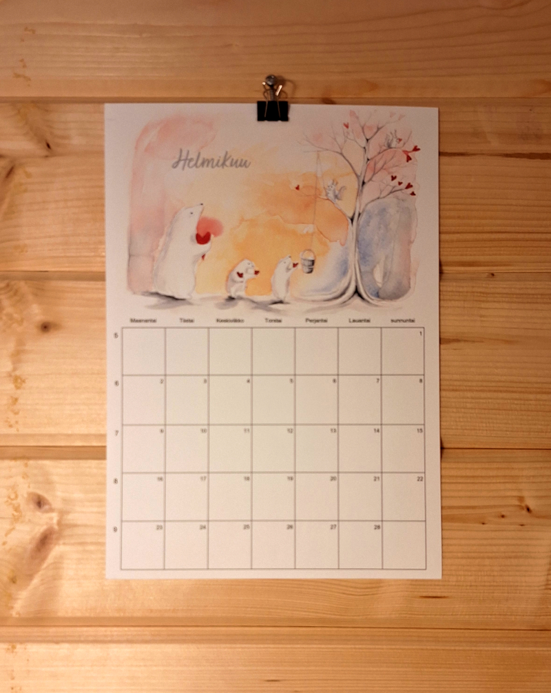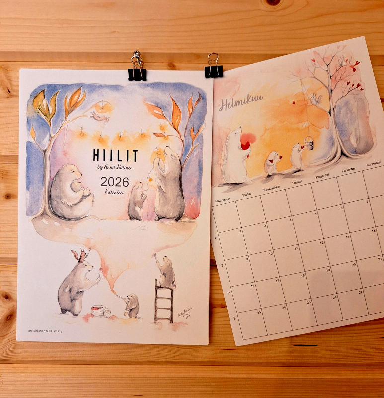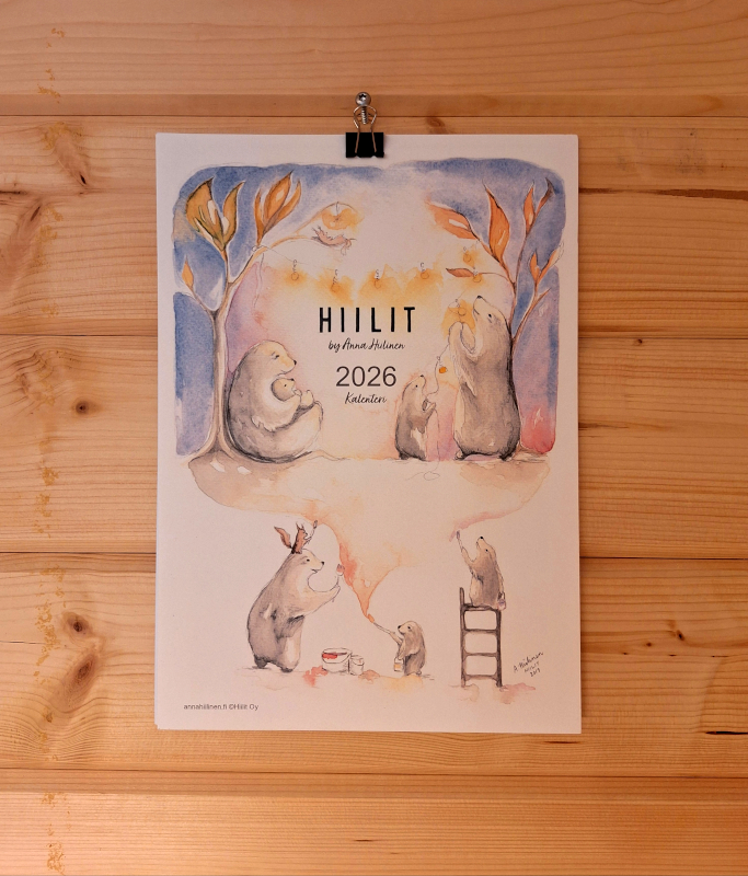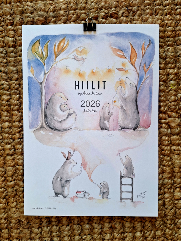 Seinäkalenteri vuodelle 2026. A4-kokoinen kalenteri, jonka kuvituksissa seikkaailee HIILIT-olennot. Kuvitus ja suunnittelu Anna Hiilinen. Copyright Hiilit Oy. Tuote on myynnissä hintaan 25€ 2.11.2025 saakka. Tuote ja postimaksut maksetaan ostettaessa ja tuote toimitetaan postitse marraskuun 2025 aikana. Jos haluat noutaa tuotteen mieluummin työhuoneeltani Järvenpäästä, niin ole minuun yhteydessä s-postitse.
