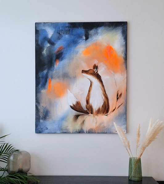 Anna Hiilisen alkuperäinen maalaus/taulu Utelias kettu. Akryyli kankaalle 2024, mitat 92,5x110,5cm