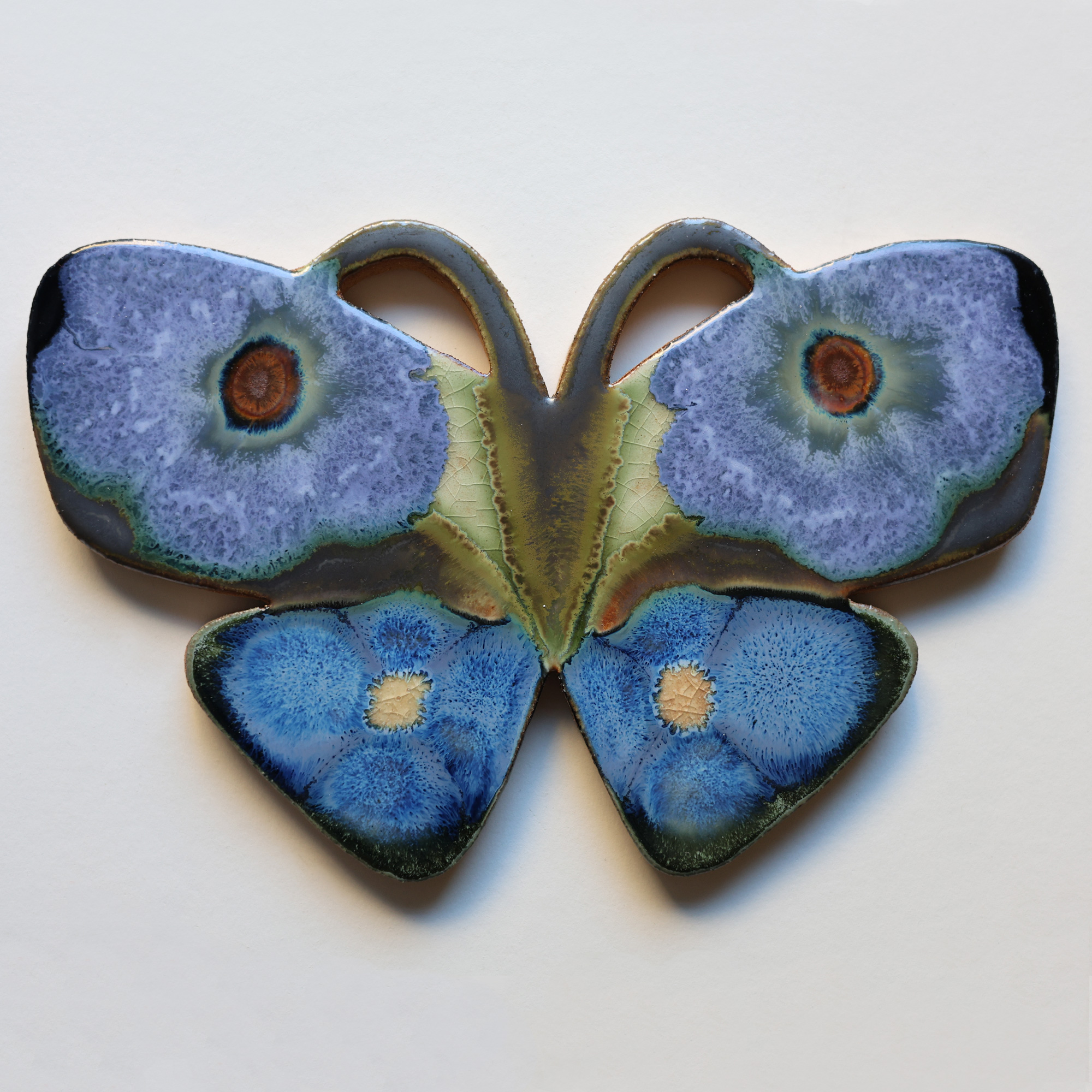 Unique ceramic butterfly relief. Glazed stoneware. Size approx. 25 × 15 × 1 cm. Signed on the back. Ready to hang with a built-in wall mount. Pickup from my studio on Fredrikinkatu in Helsinki is available by arrangement. The artwork will be dispatched within one week of purchase.