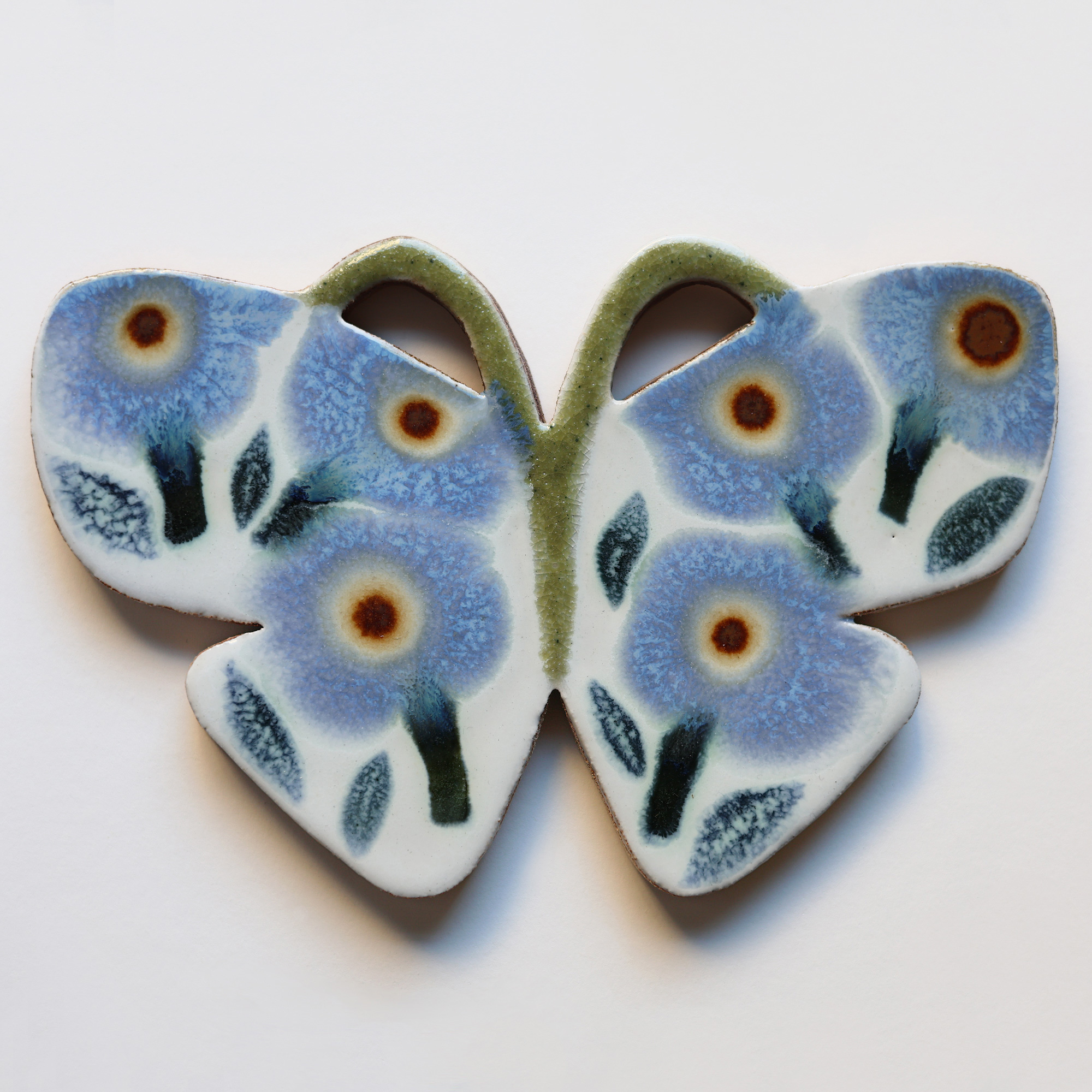 Keraaminen uniikki perhosreliefi. Lasitettua kivitavaraa. Koko n. 25 × 15 × 1 cm. Signeeraus takana. Teoksen voi ripustaa seinälle yhdellä naulalla reliefin takana olevan kiinnityksen avulla. Nouto työhuoneeltani Fredrikinkadulta Helsingistä erikseen sovittaessa. Postitettaessa teos lähetetään viikon sisällä tilauksesta.