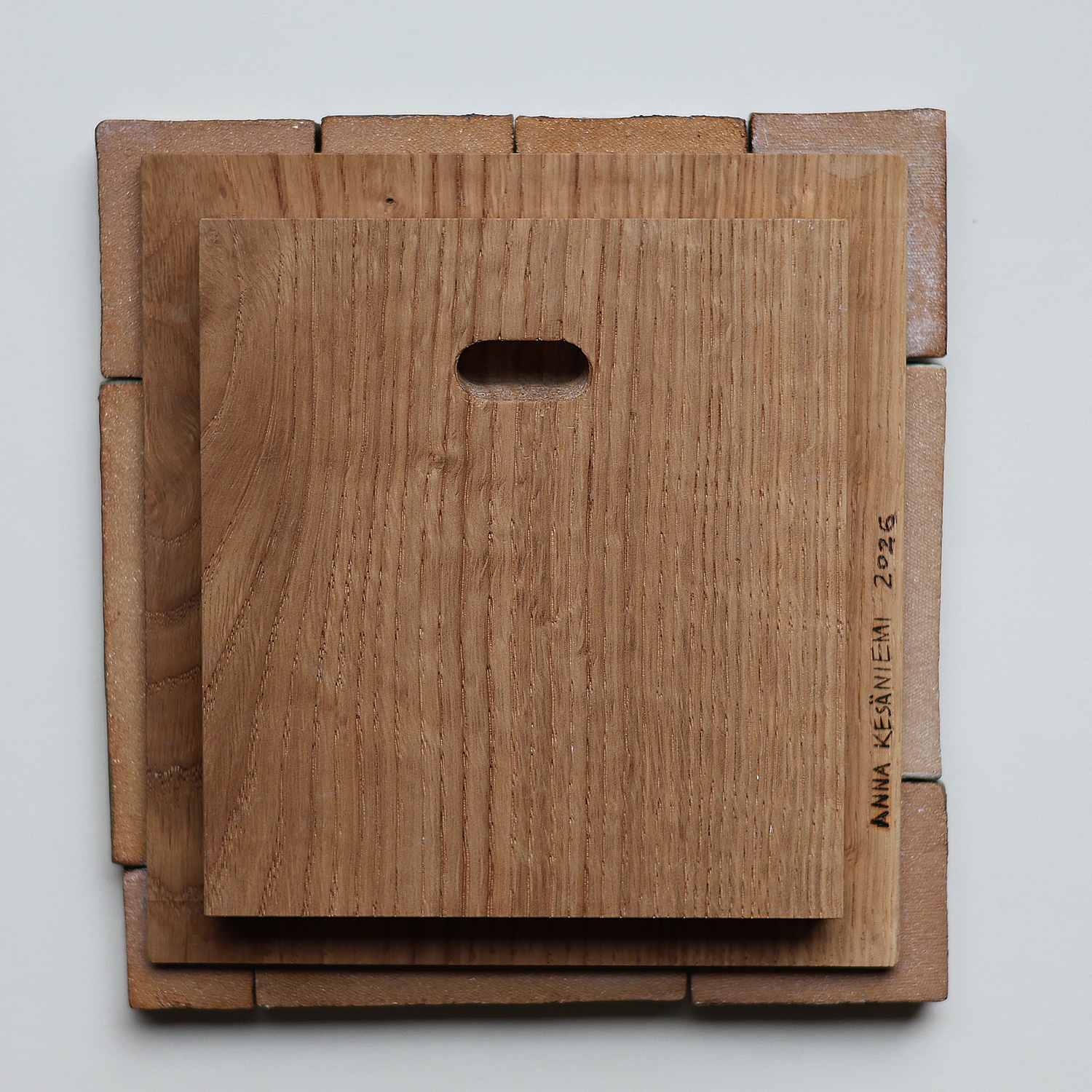 Unique ceramic collage artwork. Glazed stoneware, signed on back. Size approx. 16,5 × 15,5 × 3 cm (incl. the frame). Each element of the collage is hand-built and glazed, resulting in a unique piece with a lively surface. The artwork is mounted on an oak frame that creates a subtle floating effect when displayed on the wall. Pickup from my studio on Fredrikinkatu in Helsinki is available by arrangement.