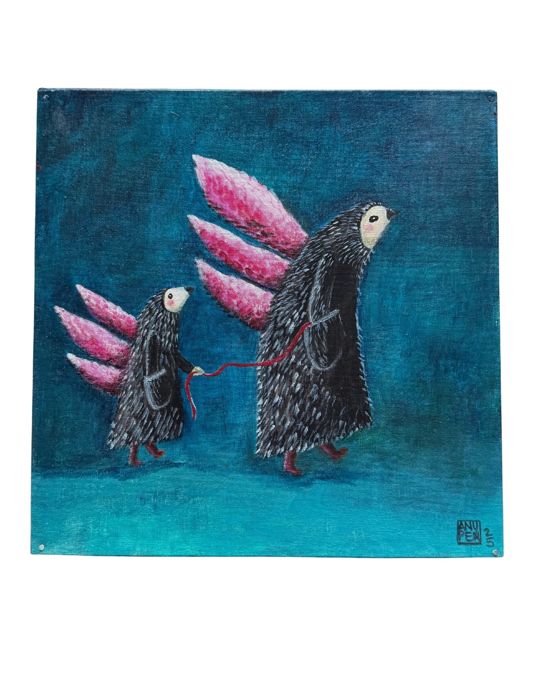 Anu Pensolan maalaus Sielulinnut- sarjasta. Akryyli levylle. Teos on kooltaan 30 x 30 x 4,5 cm