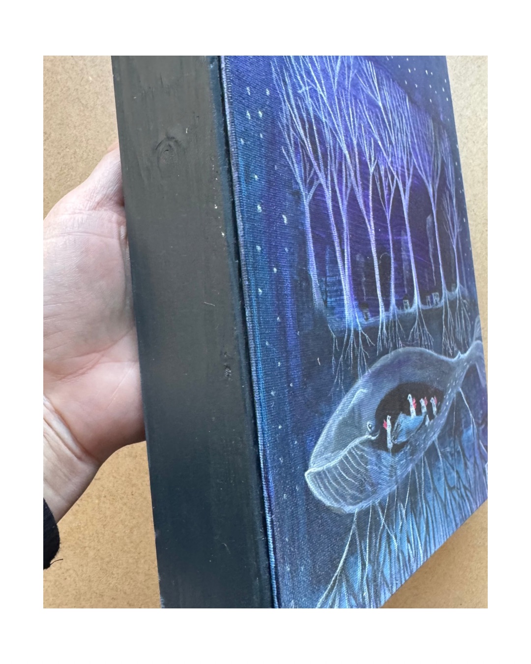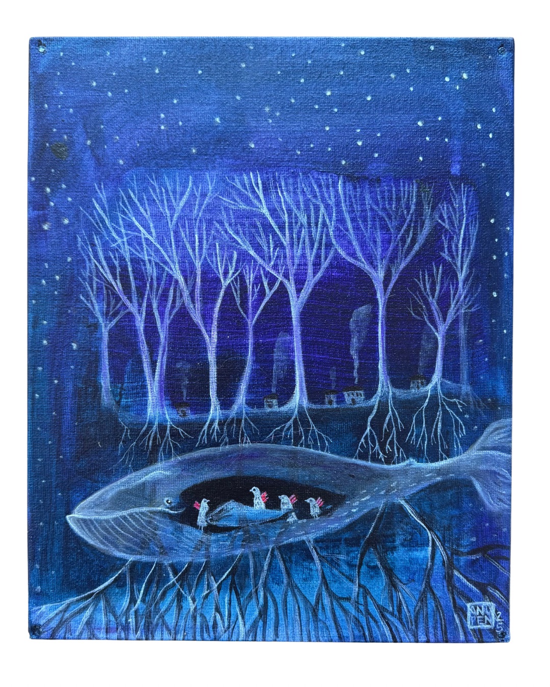 Anu Pensolan maalaus Sielulinnut- sarjasta. Akryyli levylle. Teos on kooltaan 30 x 24 x 4,5 cm