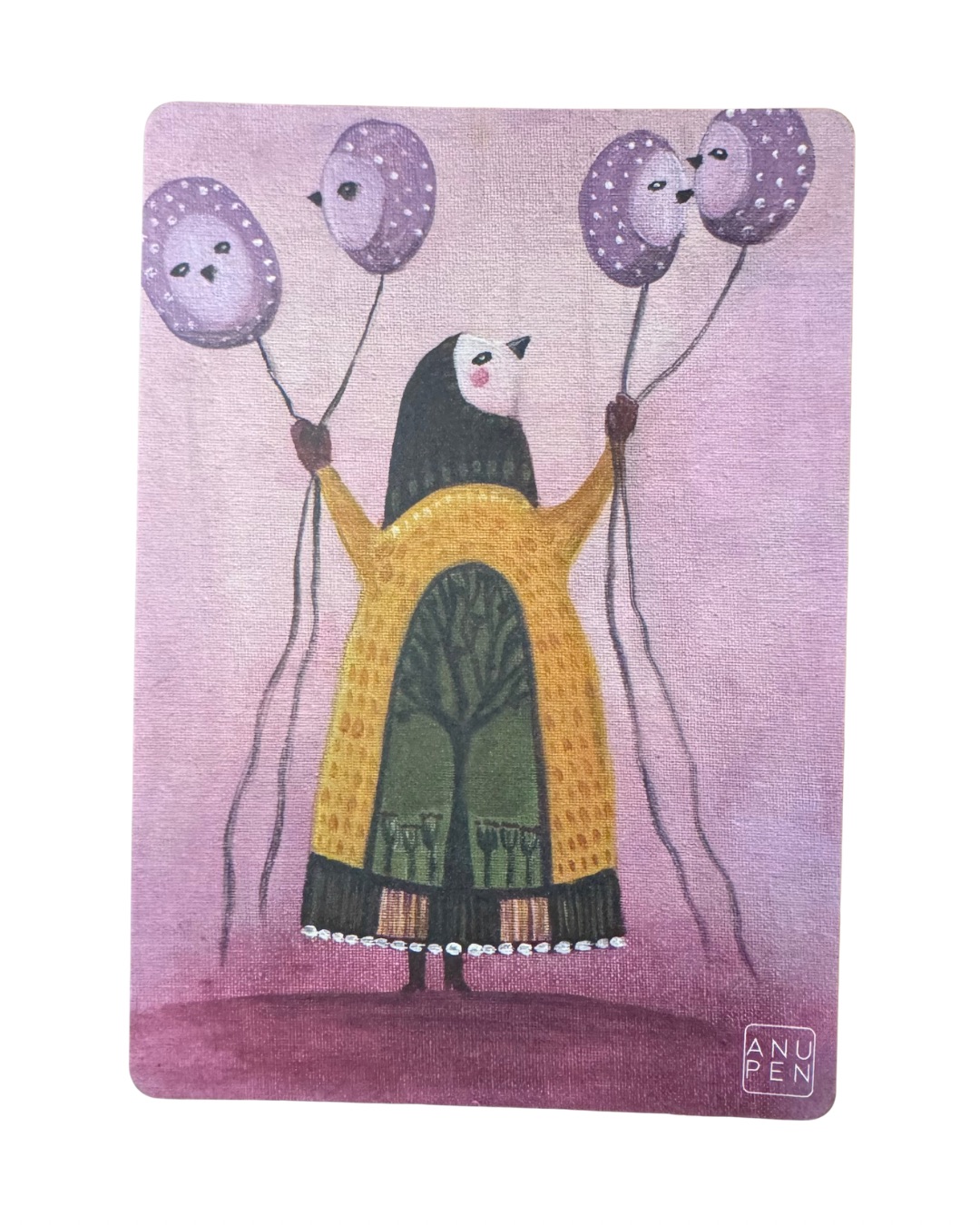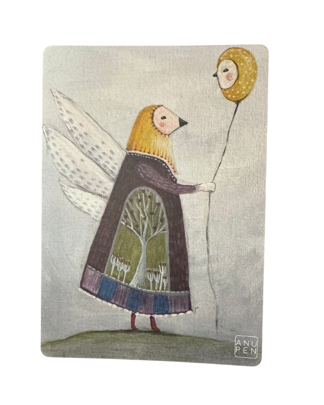 Kuusi A5-kokoista printtiä Anun syksyn 2025 maalauksista. Pakkaus sisältää printit teoksista Kotimatkalla, säänhaltija, sateentekijä, maailmaisissa, sielulintu ja ilmapallo, sielulintu ja ilmapallot. Painettu laadukkaalle, mattapintaiselle 350g paperille, pyöristetyt kulmat.