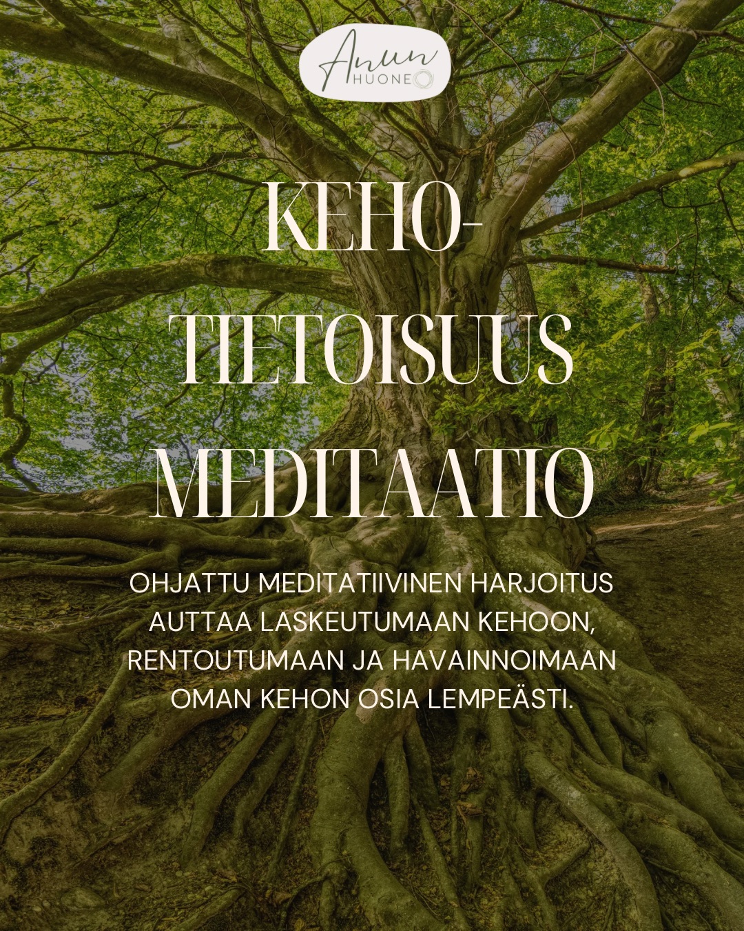 Kehotietoisuusmeditaatio aloitetaan istuen tehtävillä, kehoa avaavilla lempeillä liikkeillä ja jatketaan selinmakuulla. Anu kuljettaa osallistujat lempeästi läpi harjoituksen, minkä jälkeen jatketaan syvärentouttavalla sointukylvyllä, eli äänimaljarentoutuksella.