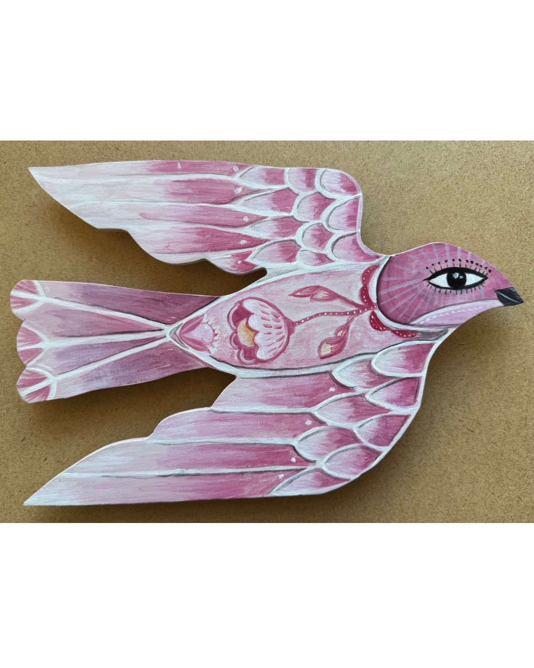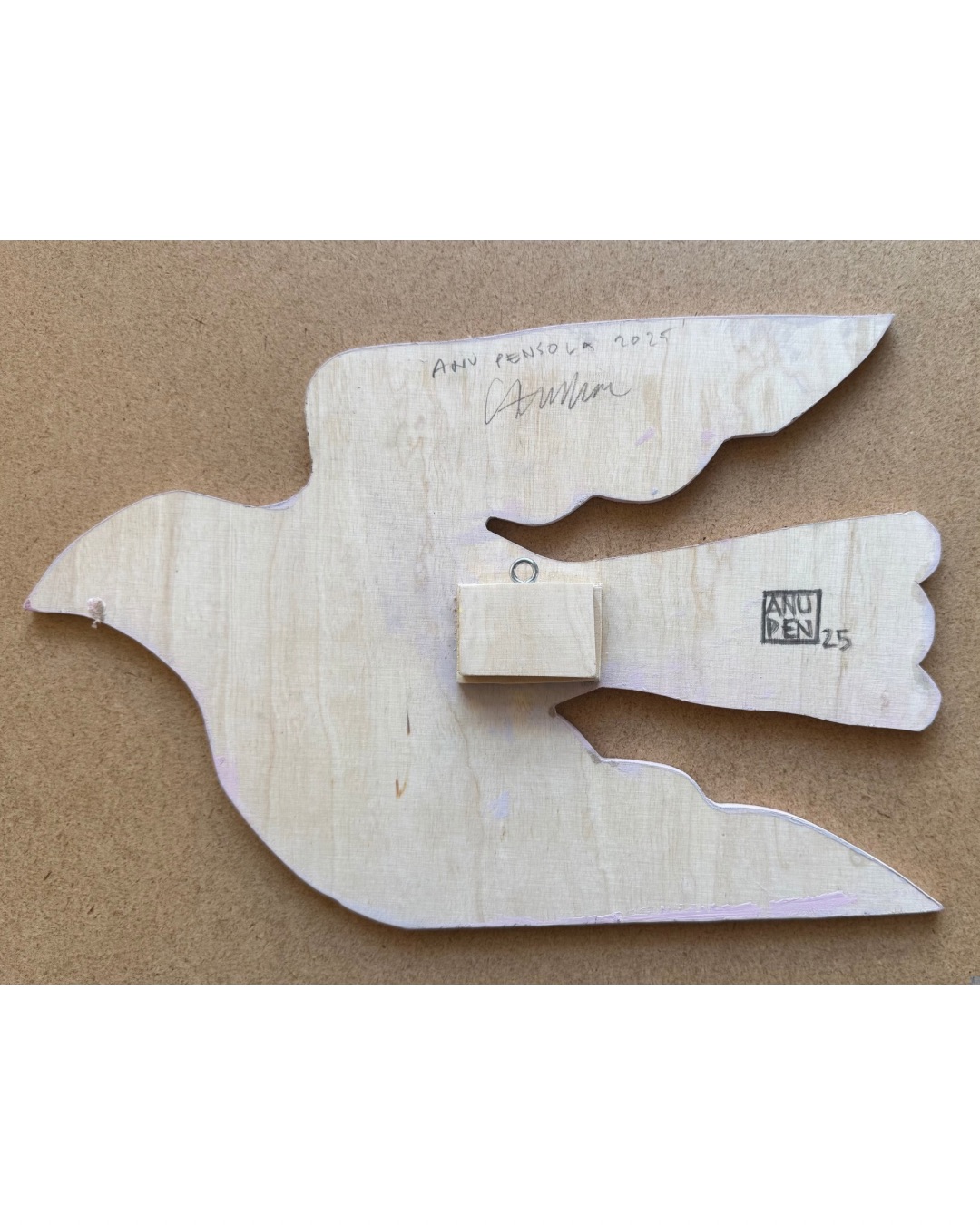 Koivuvanerinen, muotosahattu, maalattu ja lakattu lintureliefi. Uniikkikappale.