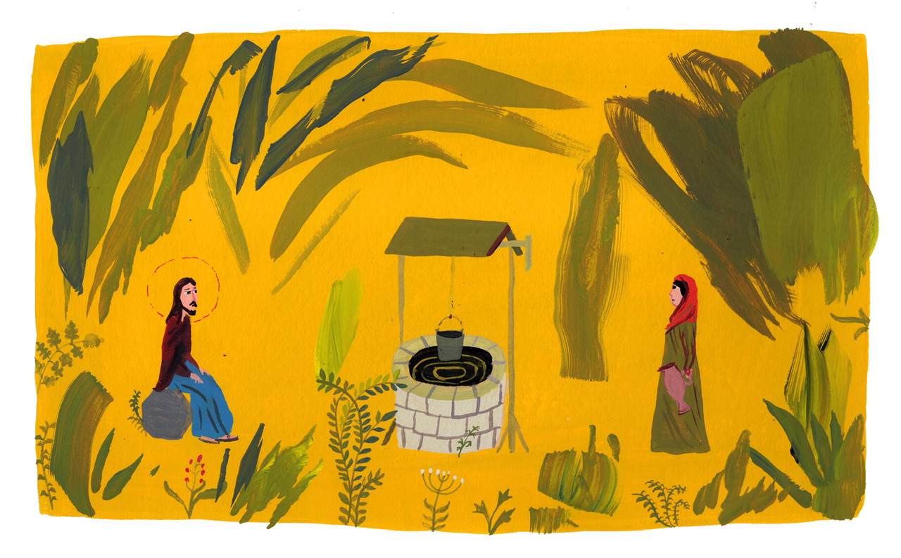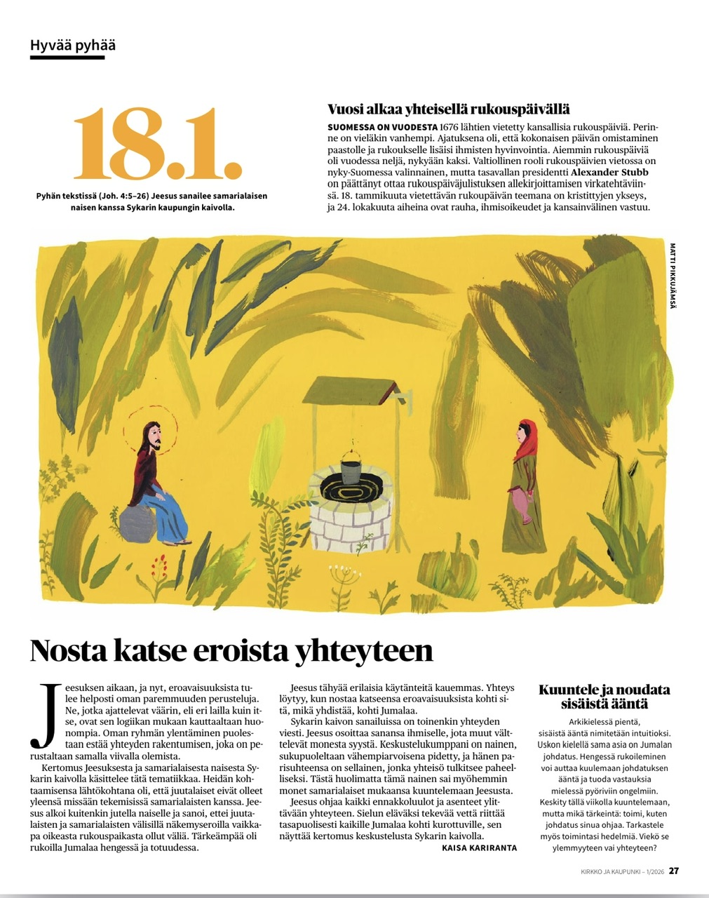 Kuvitusoriginaali Kirkko ja kaupunki -lehteen. Akryyli paperille, 42cm x 26cm / Original illustration, acrylic on paper, size 42cm x 26cm. Signed.