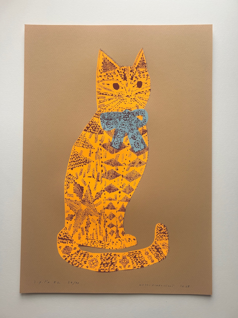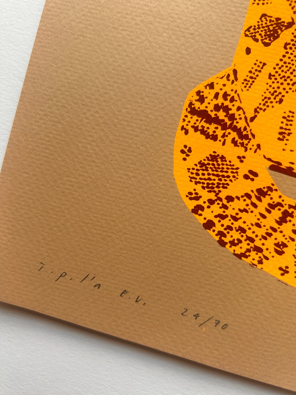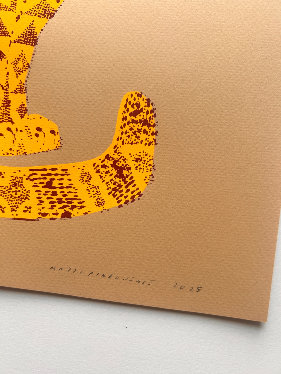 Serigrafia (mm neonoranssi) beigelle paperille. Koko 297x420 mm. Signeerattu. Vedostettu käsin Kalasataman Seripajassa. 70 kpl numeroitu vaihtelevan värinen sarja. Serigraphic print on burgund beige paper. Size 297x420 mm. Variable edition of 70, numbered and signed.