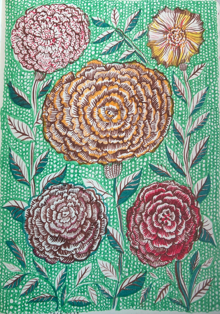 Erilaiset tussit paperille. Koko 21x29 cm. Signeerattu. Various markers on paper. Size 21x29 cm. Signed.