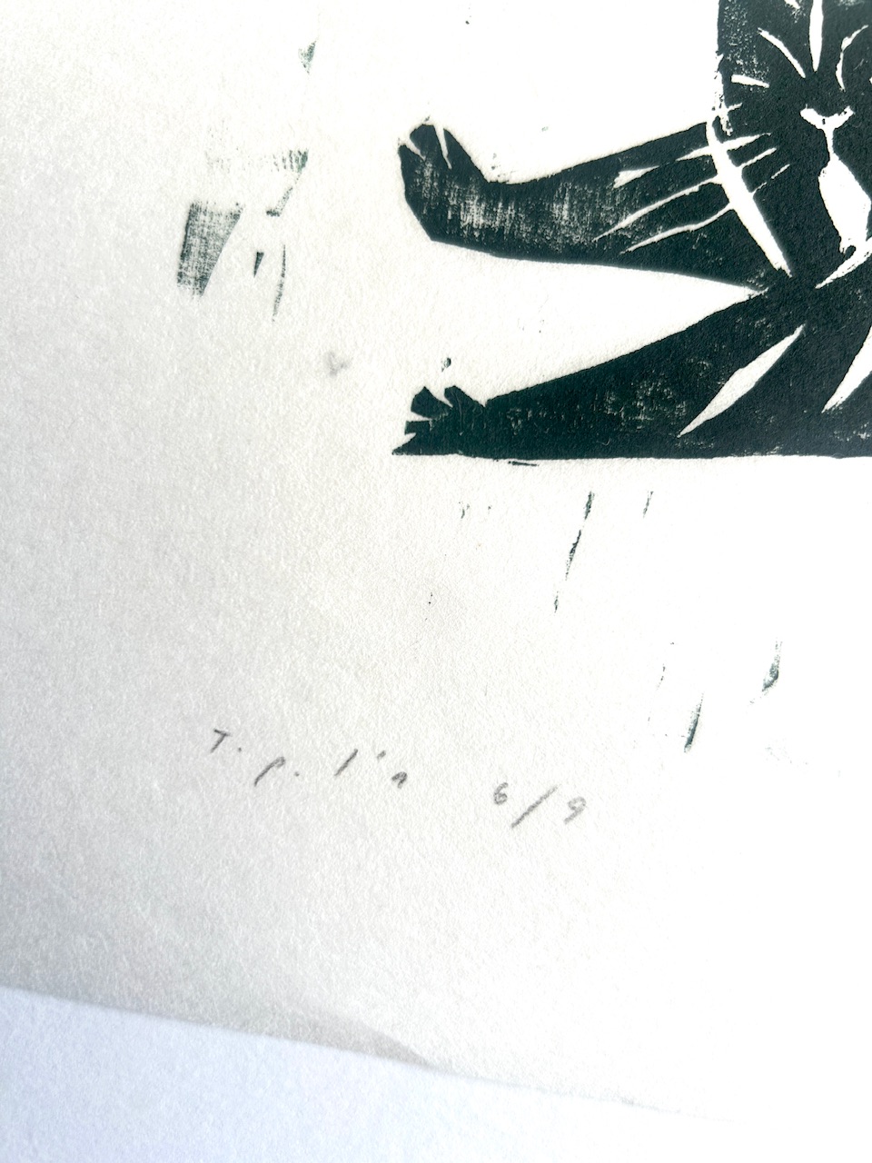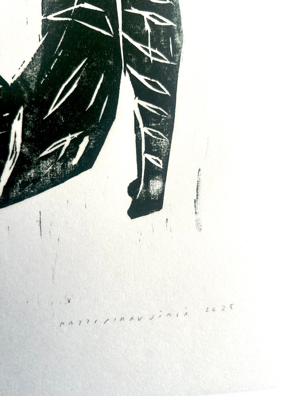Puupiirros riisipaperille, koko 28 x 38 cm. 9 kpl sarja, numero 6. Reunoissa varaa rajausta varten. Woodcut print on rice paper, size 28 x 38 cm. Number 6 from edition of 9.