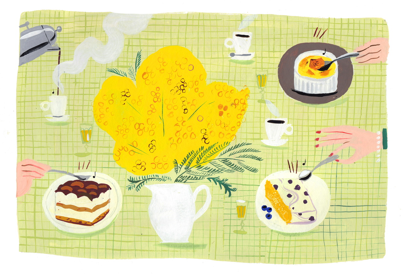 Kuvitusoriginaali Glorian ruoka ja viini-lehteen. Akryyliväri paperille, 42cm x 26cm / Original illustration, acrylic color on paper, size 42cm x 26cm. Signed.