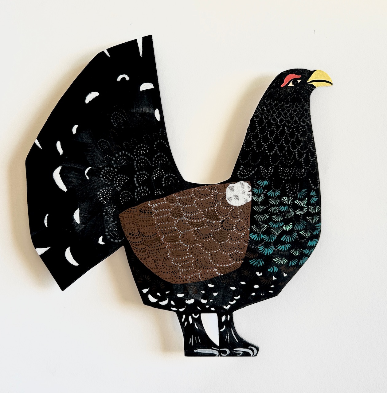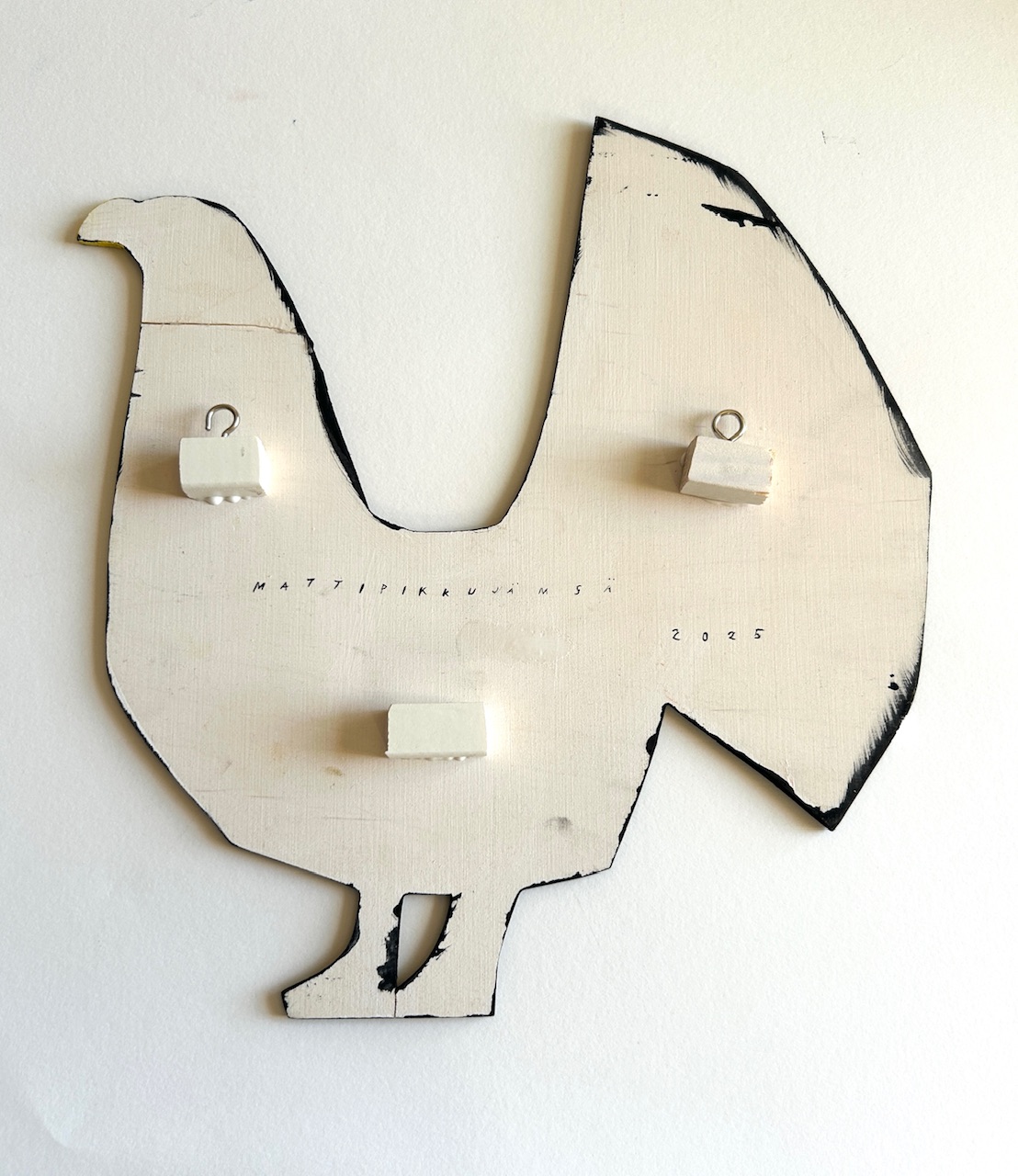 Akryyliväri vanerille, L28cm, K29cm. Signeerattu. Takana seinäkiinnike. Kaula katkennut alkuvaiheessa jo ennen maalausta, liimattu (katso kuva takaa). Acrylic color on plywood, W28cm, H29cm. Signed. On the back: wooden block with hook.