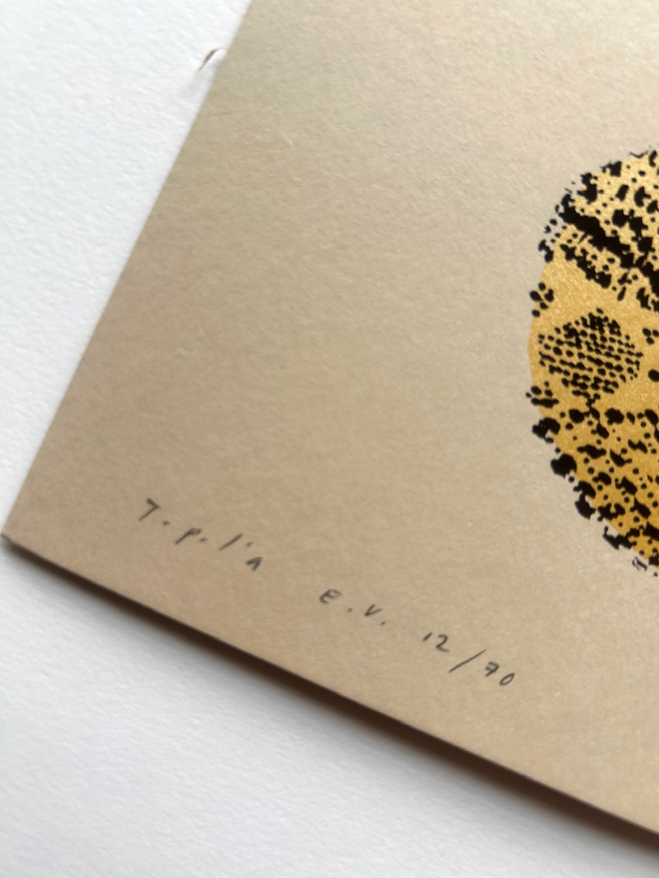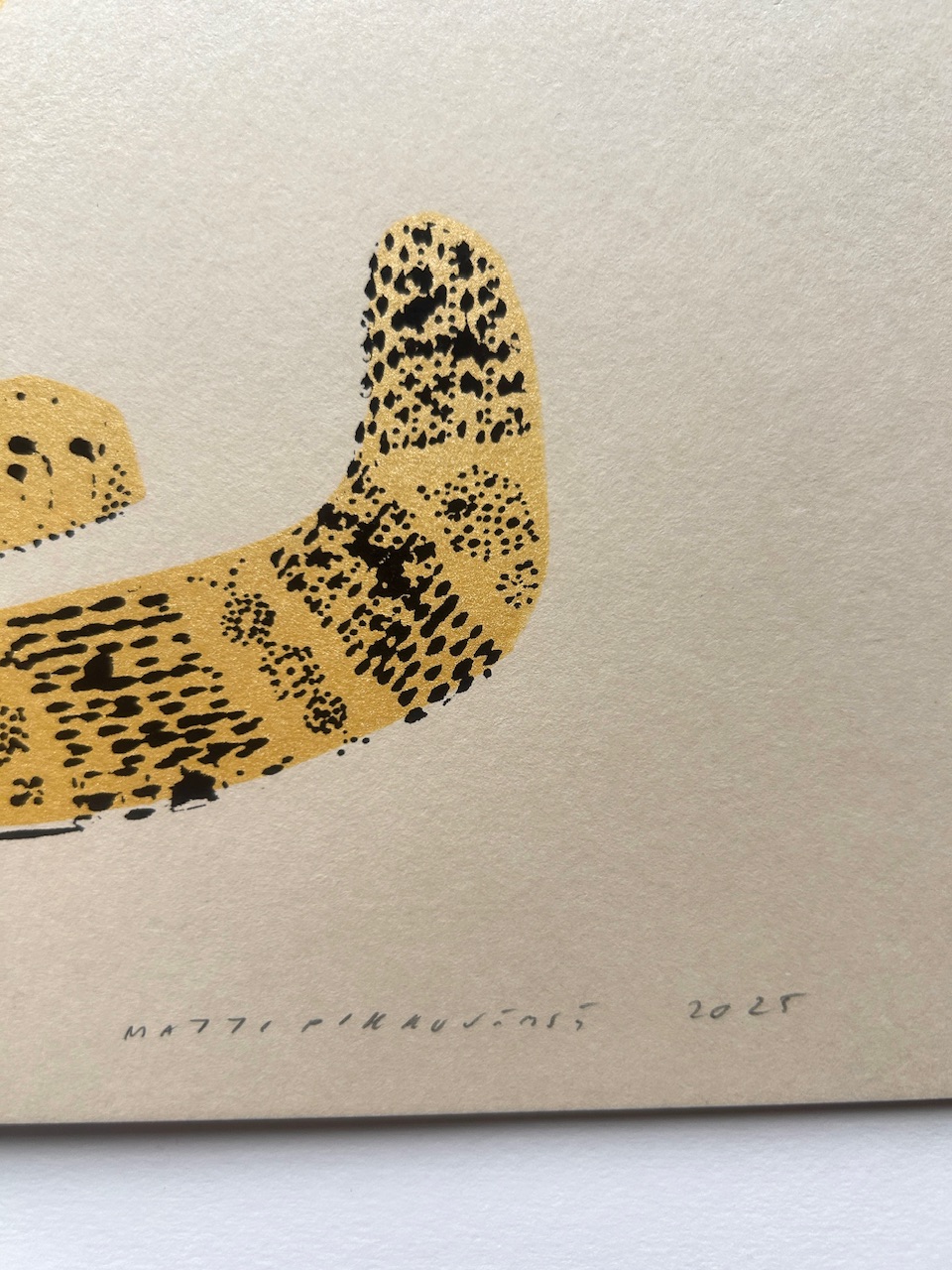 Serigrafia harmaalle paperille. Koko 297x420 mm. Signeerattu. Vedostettu käsin Kalasataman Seripajassa. 70 kpl numeroitu vaihtelevan värinen sarja. Serigraphic print on gray paper. Size 297x420 mm. Variable edition of 70, numbered and signed.