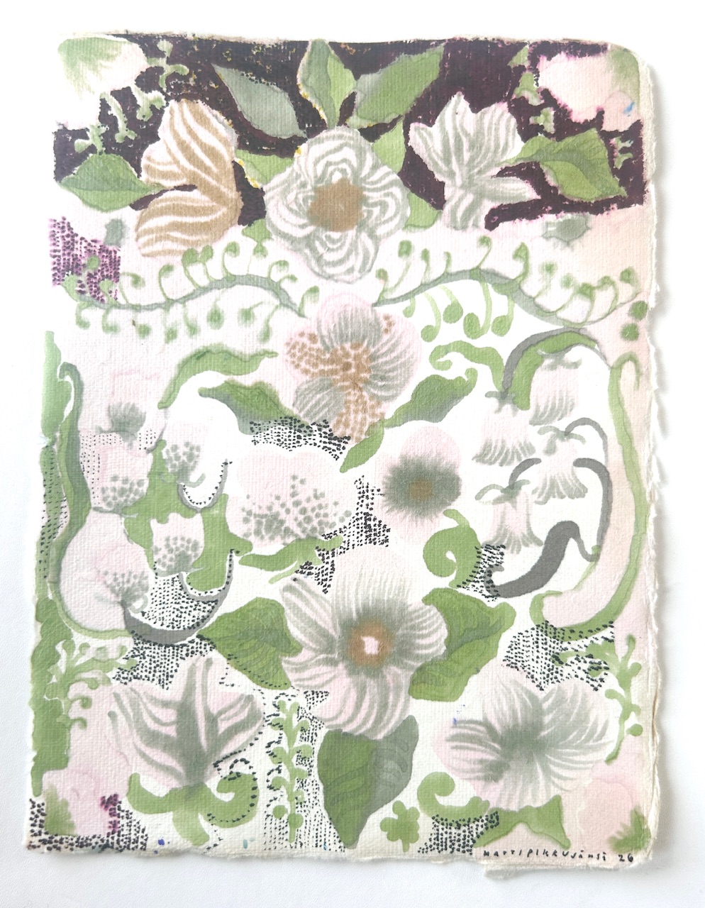 Erilaiset tussit, kuitukynät, mustekynät käsintehdylle paperille, koko 15x20.5cm. Various pen and markers on handmade paper, size 15x20.5cm.