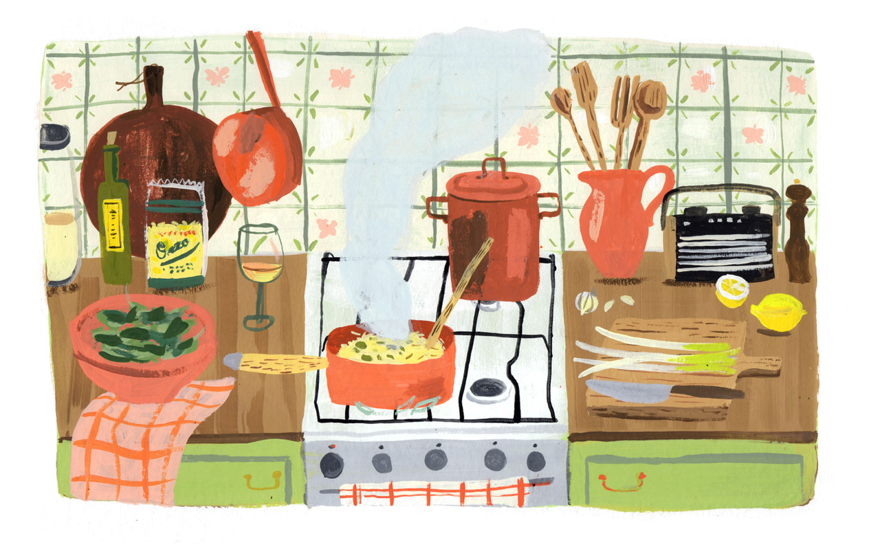 Kuvitusoriginaali Glorian ruoka ja viini-lehteen. Akryyliväri paperille, 42cm x 26cm / Original illustration, acrylic color on paper, size 42cm x 26cm. Signed.