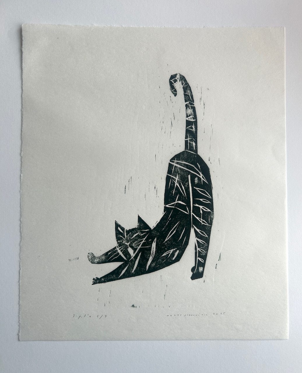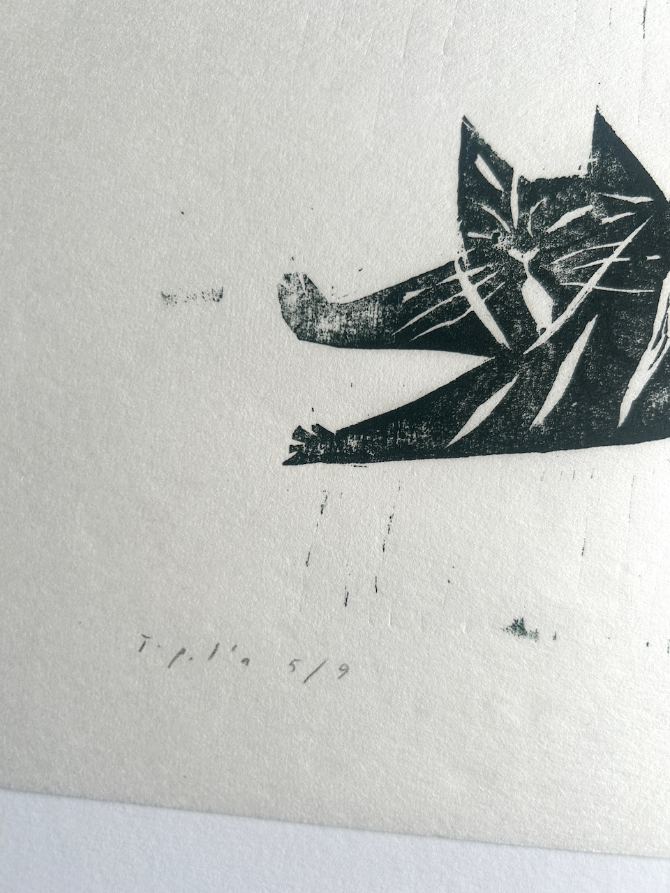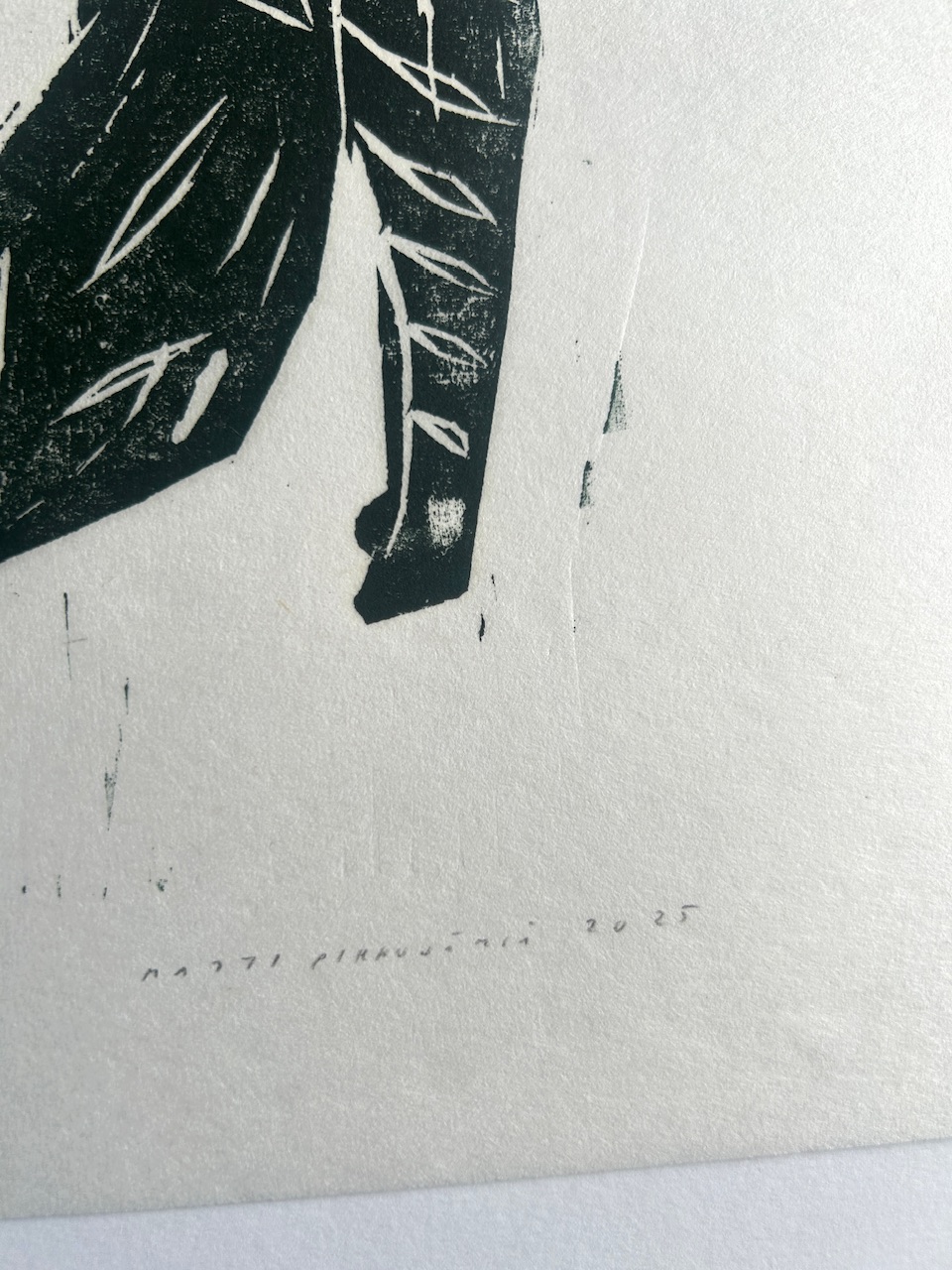 Puupiirros riisipaperille, koko 28 x 38 cm. 9 kpl sarja, numero 5. Reunoissa varaa rajausta varten. Woodcut print on rice paper, size 28 x 38 cm. Number 5 from edition of 9.