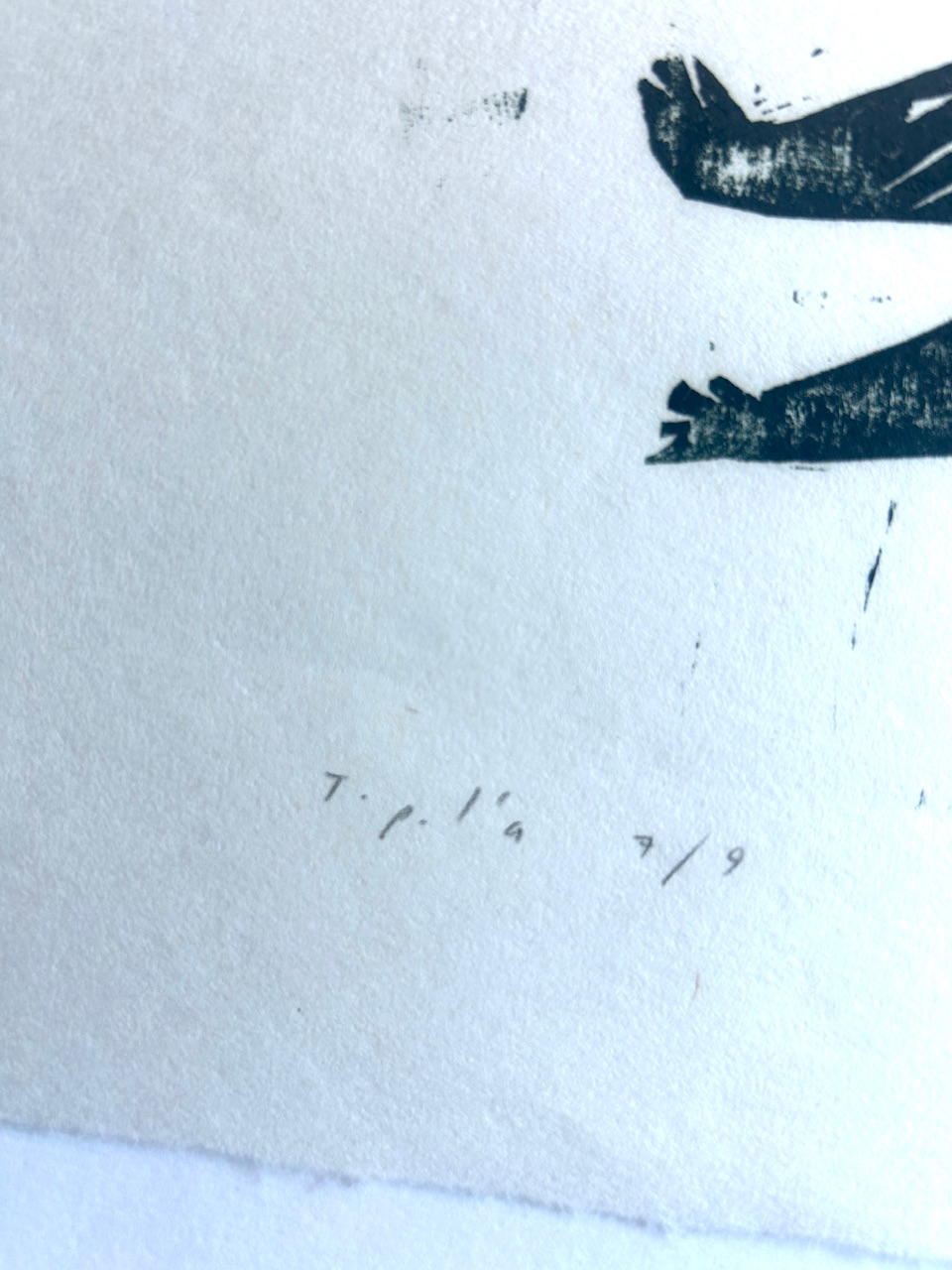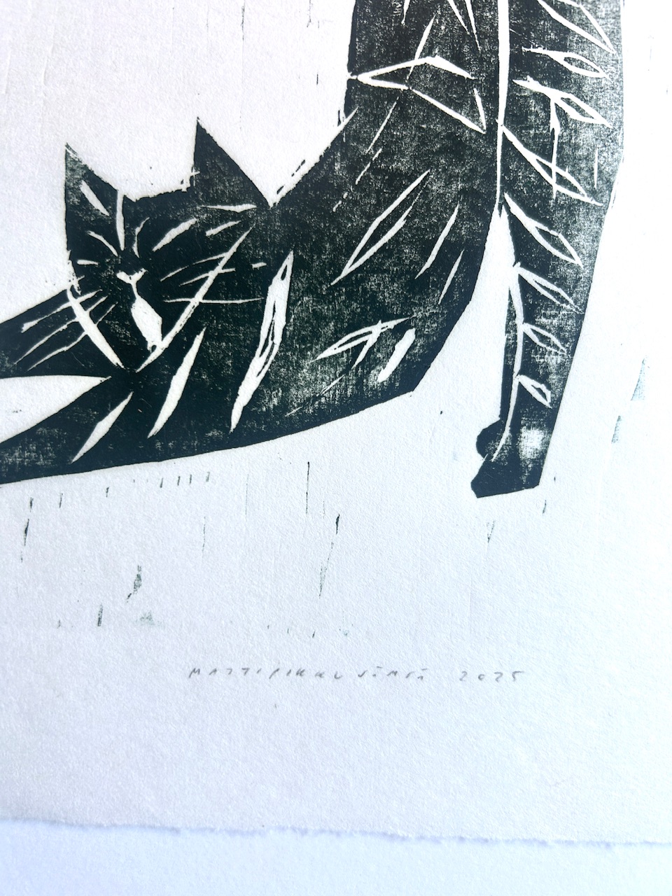 Puupiirros riisipaperille, koko 28 x 38 cm. 9 kpl sarja, numero 7. Reunoissa varaa rajausta varten. Woodcut print on rice paper, size 28 x 38 cm. Number 7 from edition of 9.