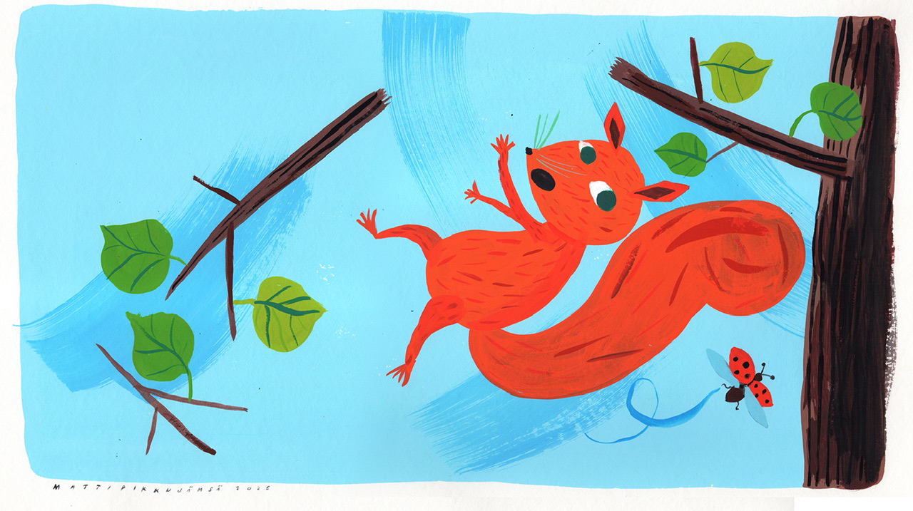 Kuvitusoriginaali kirjaan Terholla on hoppu! (Teksti Lotta Sonninen, Orava-kirjat 2026) Akryyliväri 500g paperille. Koko 25x48cm. Acrylic color on 500g paper. Size 25x48cm.