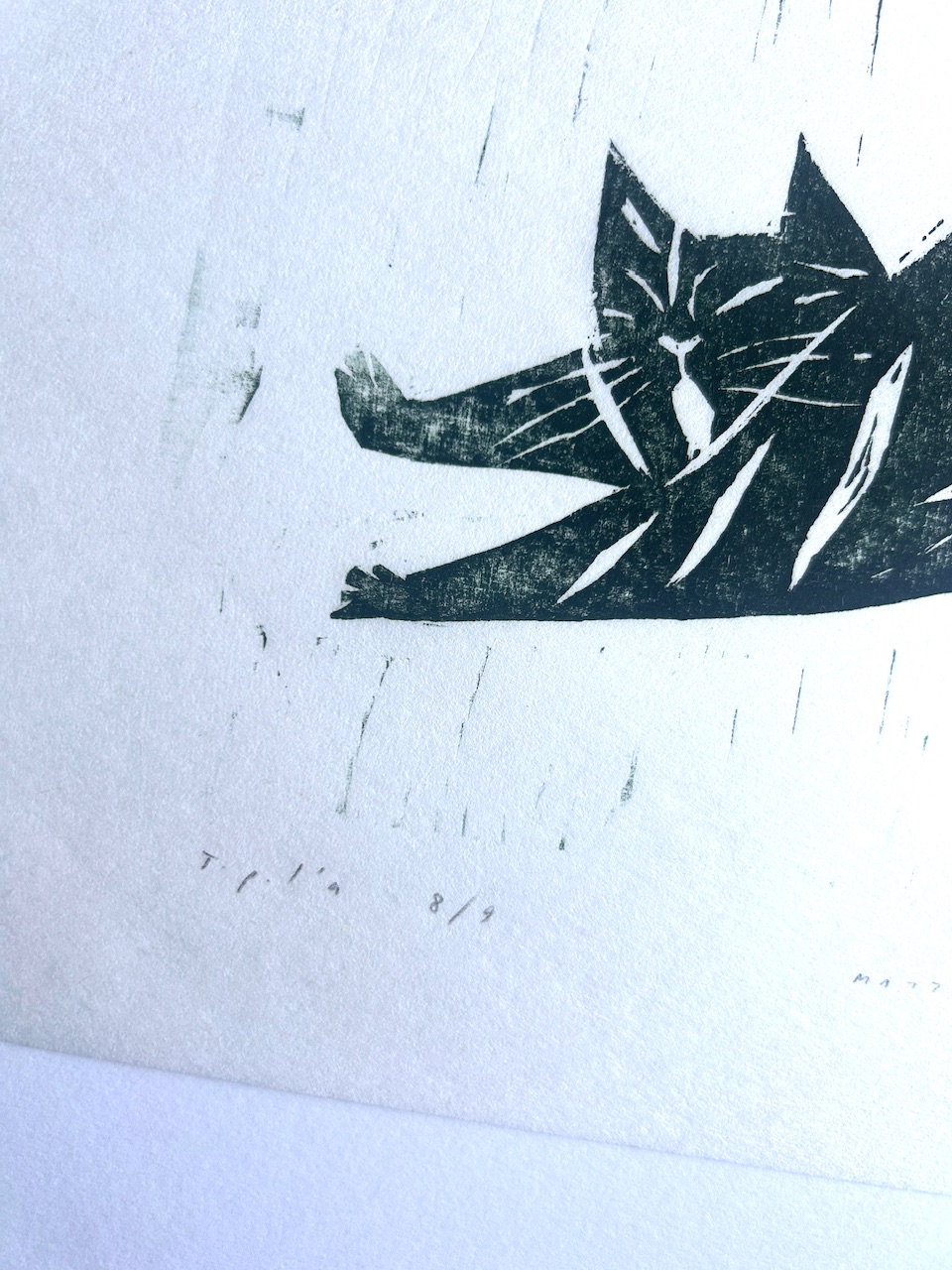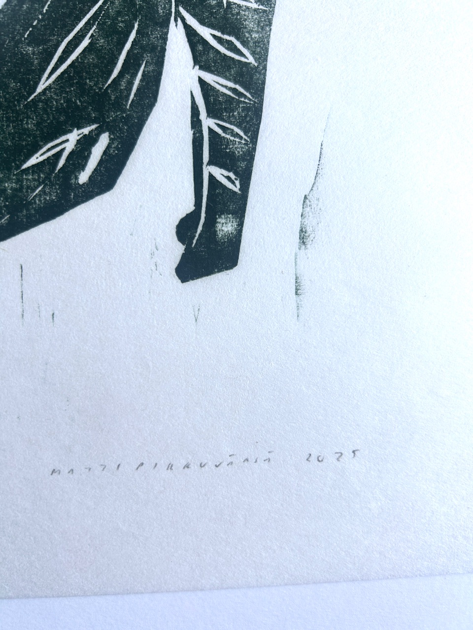 Puupiirros riisipaperille, koko 28 x 38 cm. 9 kpl sarja, numero 8. Reunoissa varaa rajausta varten. Woodcut print on rice paper, size 28 x 38 cm. Number 8 from edition of 9.