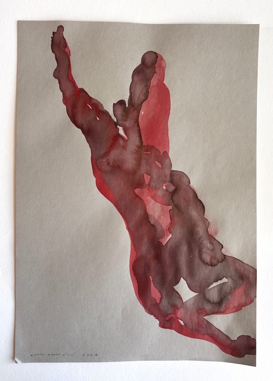 Akvarelli ja muste 300g harmaalle paperille, koko 297x420mm. Watercolor and ink on grey paper. Size 297x420mm.