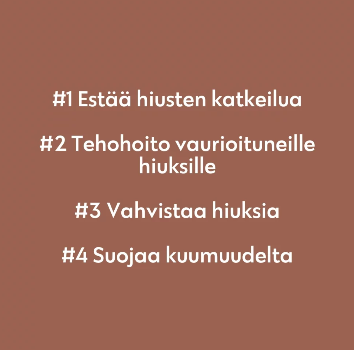 Suojaa – Biopolymeerit suojaavat hiusta, antioksidantit estävät vapaiden radikaalien aiheuttamia vaurioita ja omenahappo tasapainottaa hiuksen pH-arvoa, vähentäen hiuksen vaurioitumista.