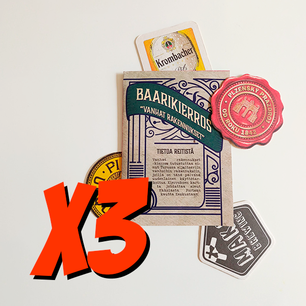 Tilaus sisältää kolme karttaa. Suositellaan kolmen hengen porukoille. Baarikierros on erilainen ja varmasti hauska tapa tutustua Turkuun ja sen monipuoliseen baaritarjontaan! Konsepti on suosittu ulkomailla, etenkin Iso-Britanniassa, ja nyt se on saatavilla myös Turussa! Vanhat rakennukset -reitti alkaa Kakolasta ja kulkee portstan kautta keskustaan. Reitin varrella on monipuolisesti kauniita rakennuksia, nähtävyyksiä ja tietenkin mitä parhaimpia baareja. Reitti Reitin kantavana teemana on esitellä vanhoja rakennuksia, jotka nykyään toimivat baareina. Kierroksen aikana pääsee nauttimaan juomista muun muassa vanhalla vankila-alueella, pankissa sekä koulussa. Baareja on kierroksella viisi kappaletta, ja ne on huolellisesti valittu laadun ja monipuolisen tarjonnan perusteella. Kun ostat Baarikierroksen saat: Huolellisesti suunnitellun reitin, joka sisältää viisi laadukasta ja mielenkiintoista baaria. Reitille varta vasten suunnitellun kartan, jonka pohjana toimii aito Turun matkailukartta vuodelta 1950. Kartassa olevan arvosteluosion, johon voi pisteyttää jokaisen kierroksella olevan baarin. Arvosteluosio tuo uudenlaisen kulman kierrokselle. Hyvä tietää ennen ostamista: Otathan huomioon, että tilauksen hintaan ei sisälly juomien hintaa, vaan ne kustannetaan itse jokaisessa baarissa erikseen. Baarien ikäraja 18 vuotta. Osa baareista saattaa edellyttää korkeampaa ikärajaa. Baarikierroksen ostaminen ei automaattisesti oikeuta sisäänpääsyyn. Sisäänpääsy voi estyä esimerkiksi siitä syystä että baari on juuri sillä hetkellä täynnä. Baarikierroksen myyjänä toimii Tap & Map Oy. Yhtiö ei vastaa kierroksella sattuneista vahingoista, eikä ole vastuussa ravintoloiden aukioloajoista, niiden muutoksista tai anniskelurajoituksista. Tap & Map Oy suosittelee nauttimaan alkoholijuomia kohtuudella.