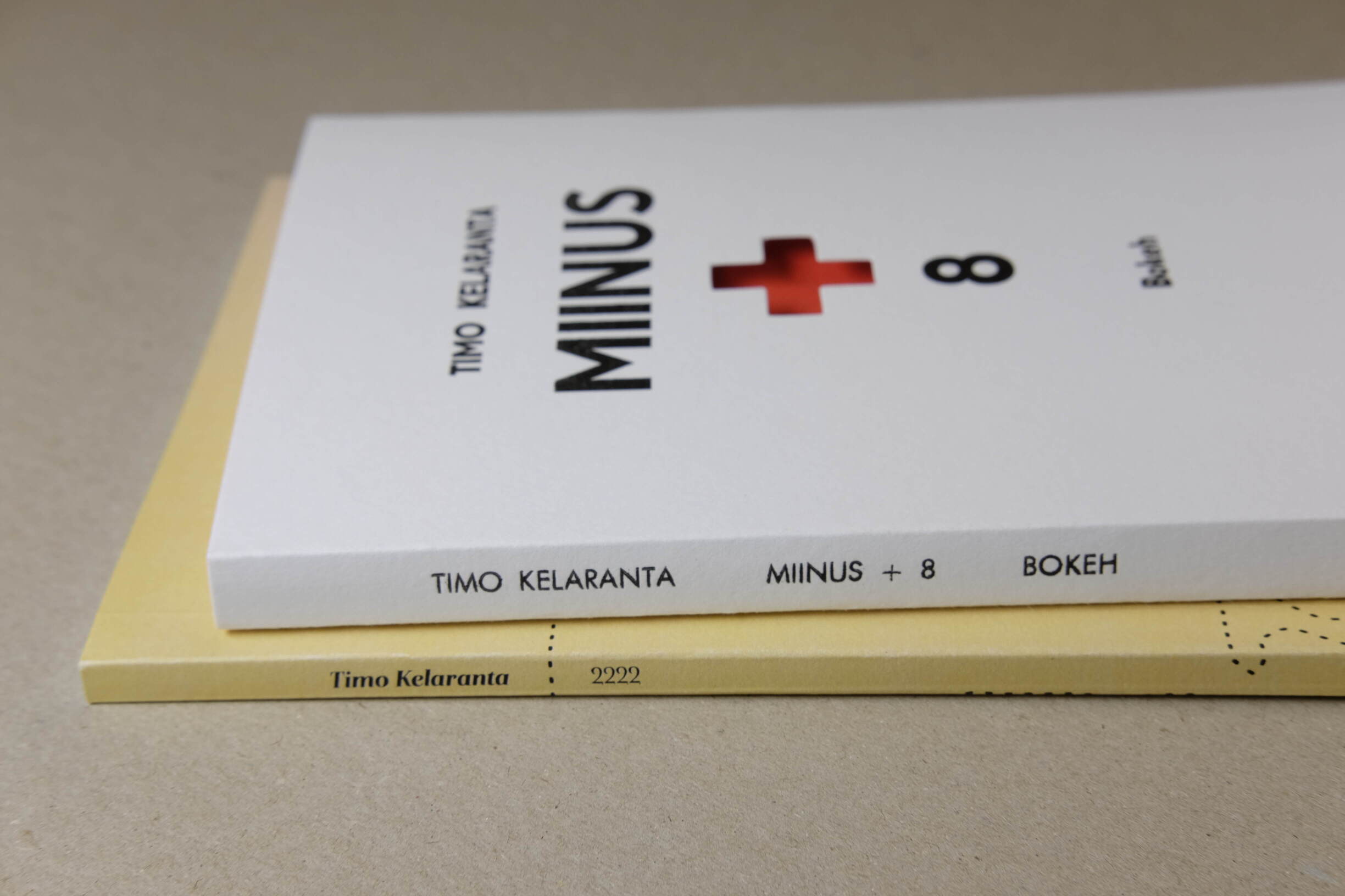 Valokuvataiteilija ja kirjailija Timo Kelarannan kaksi proosakokoelmaa, vuonna 2022 ilmestyneen 2222-kokoelman jälkieditio ja uusi Miinus + 8 yhteishintaan.