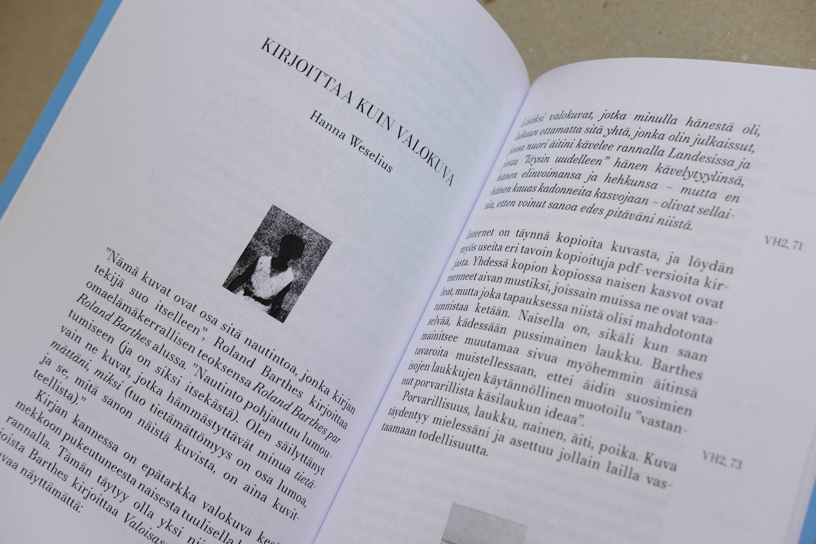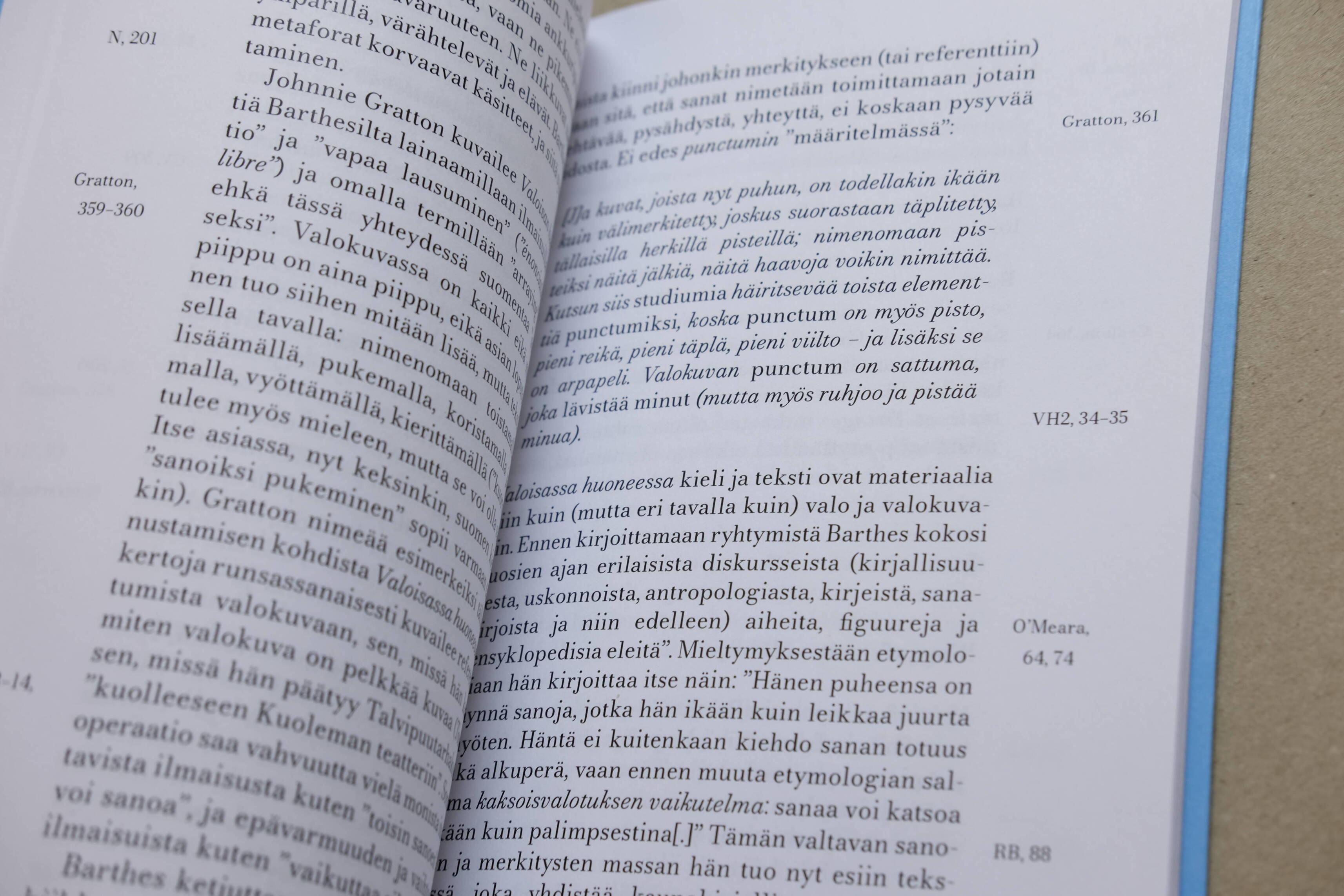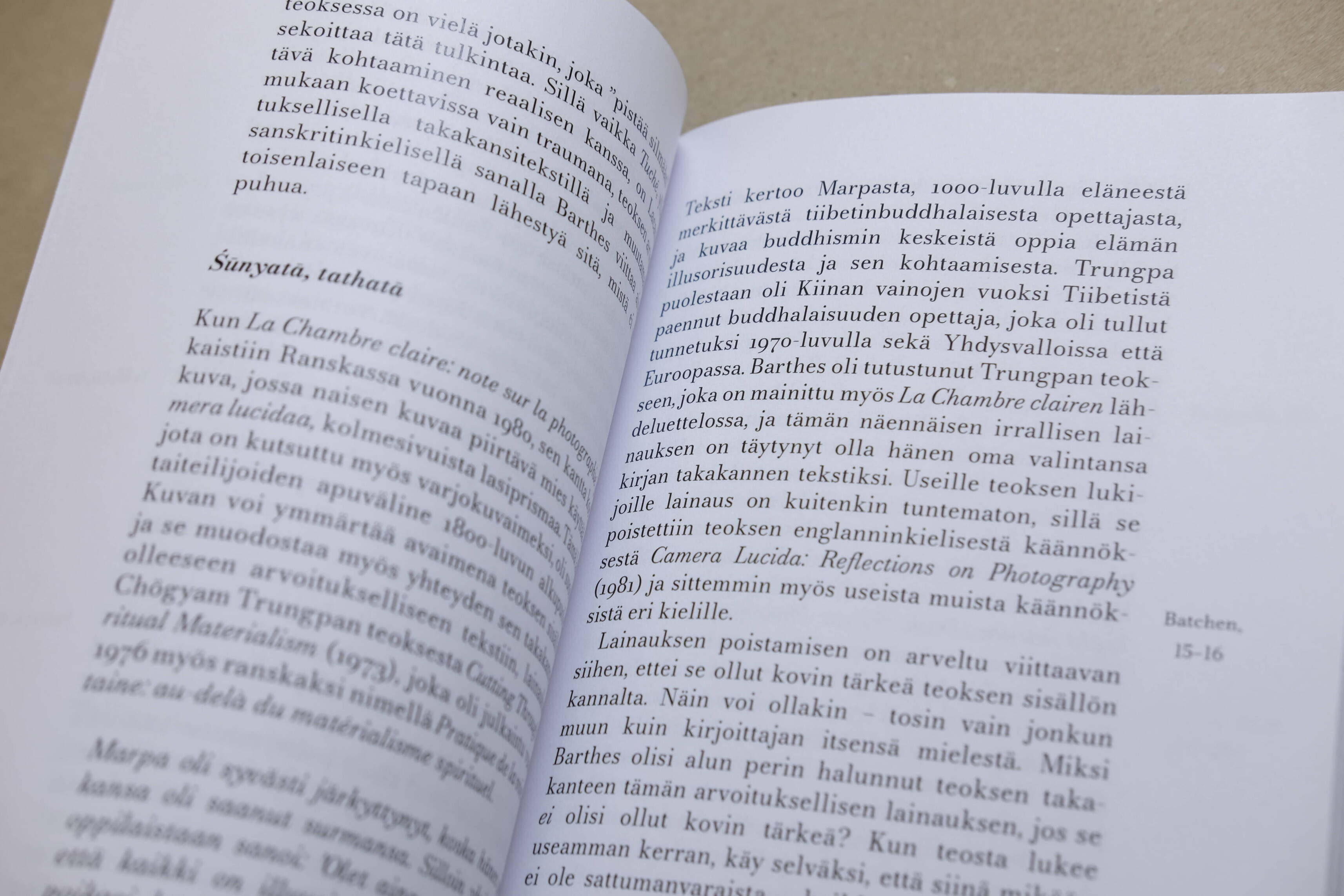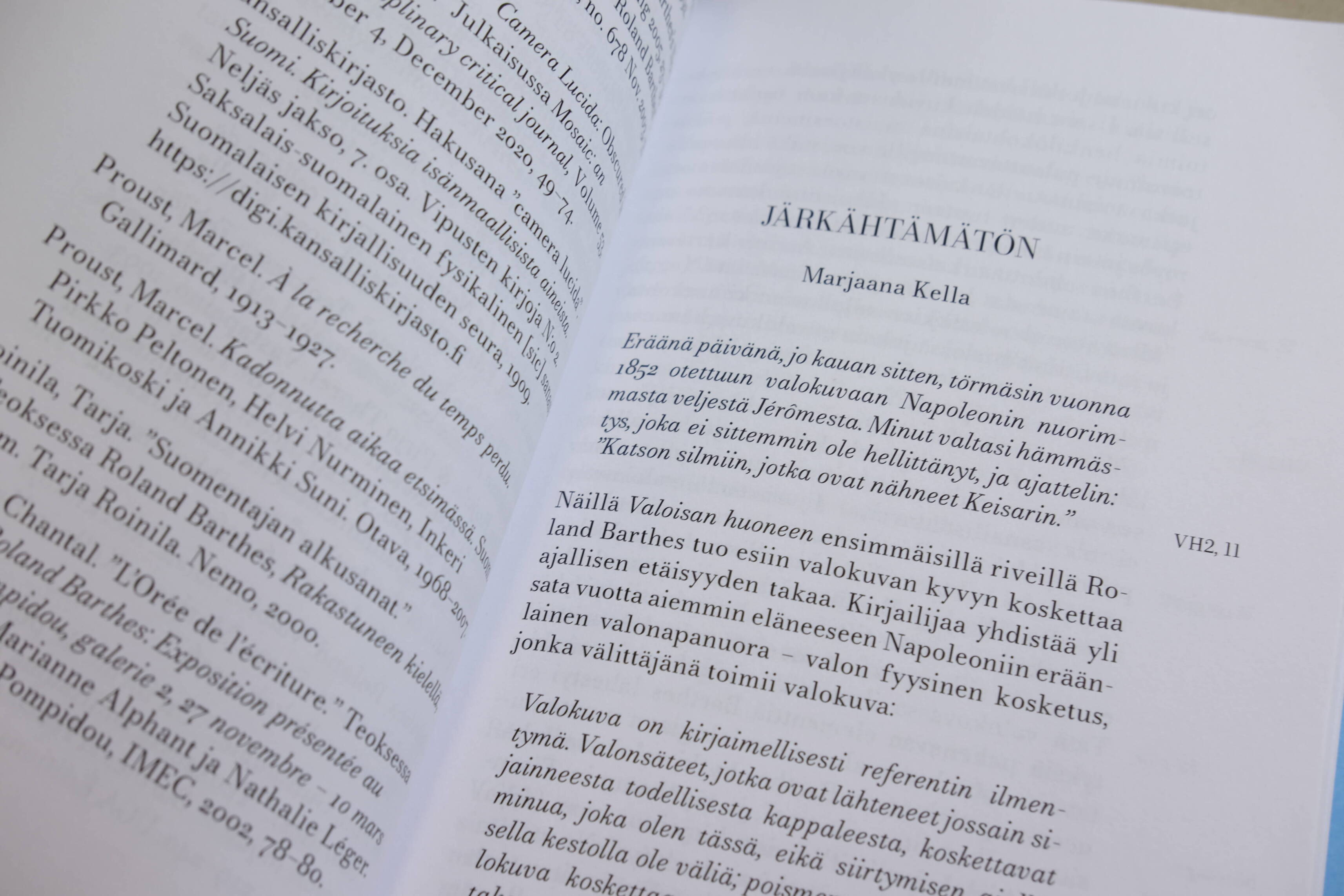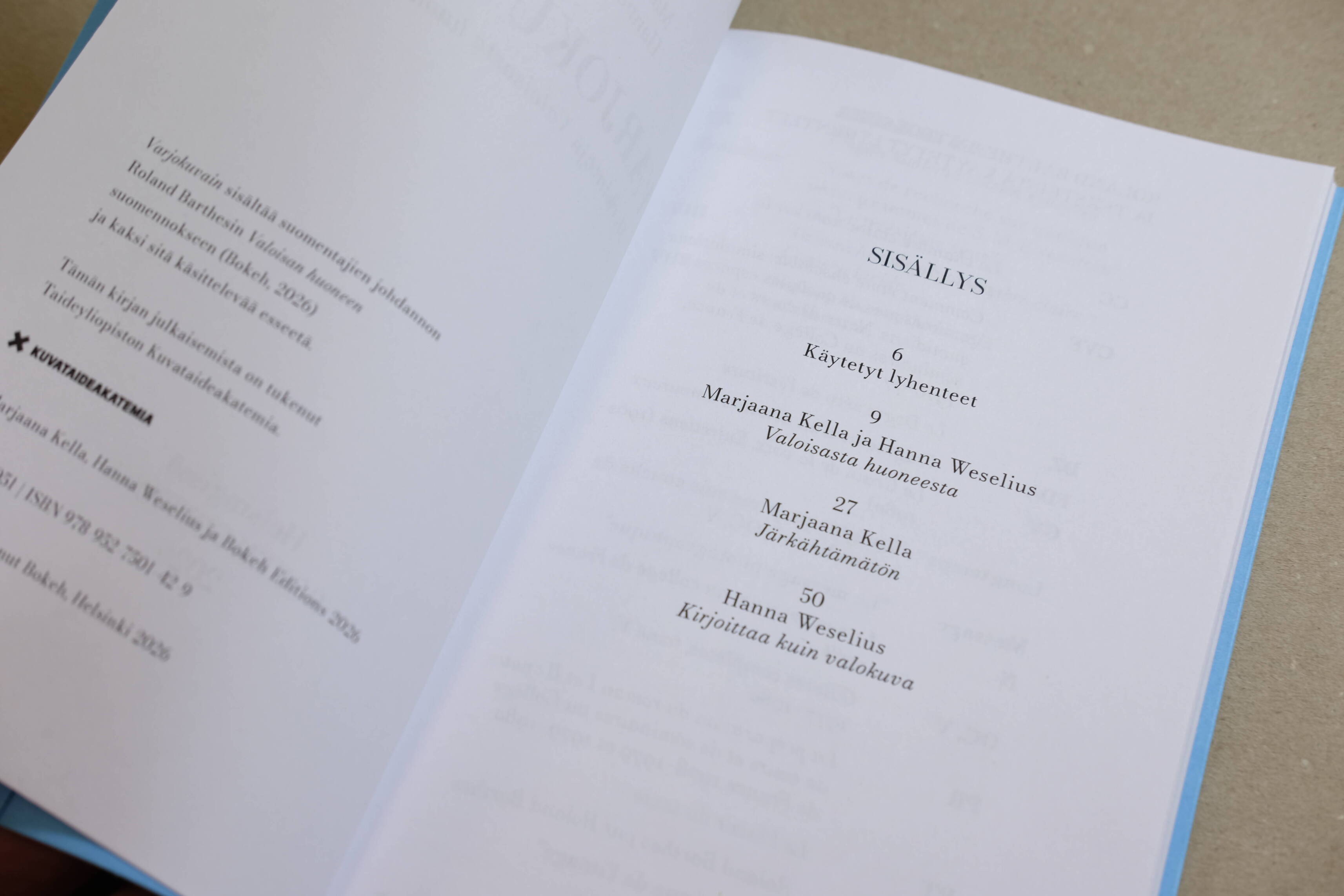 Suomennos kuitenkin julkaistaan ilman johdantoa tai jälkisanaa, eikä siihen sisälly selityksiä. Niiden paikka on tässä pienessä kirjassa, joka sisältää suomentajien johdannon Barthesin tekstiin sekä kaksi esseetä sen herättämistä aiheista. Kella esittelee "Järkähtämätön"-esseessään Barthesin valokuva-ajattelua ja muutamien buddhalaisten käsitteiden käyttöä Valoisassa huoneessa. Weseliusta taas kiinnostavat kirjoituksen ja valokuvan yhtymäkohdat.