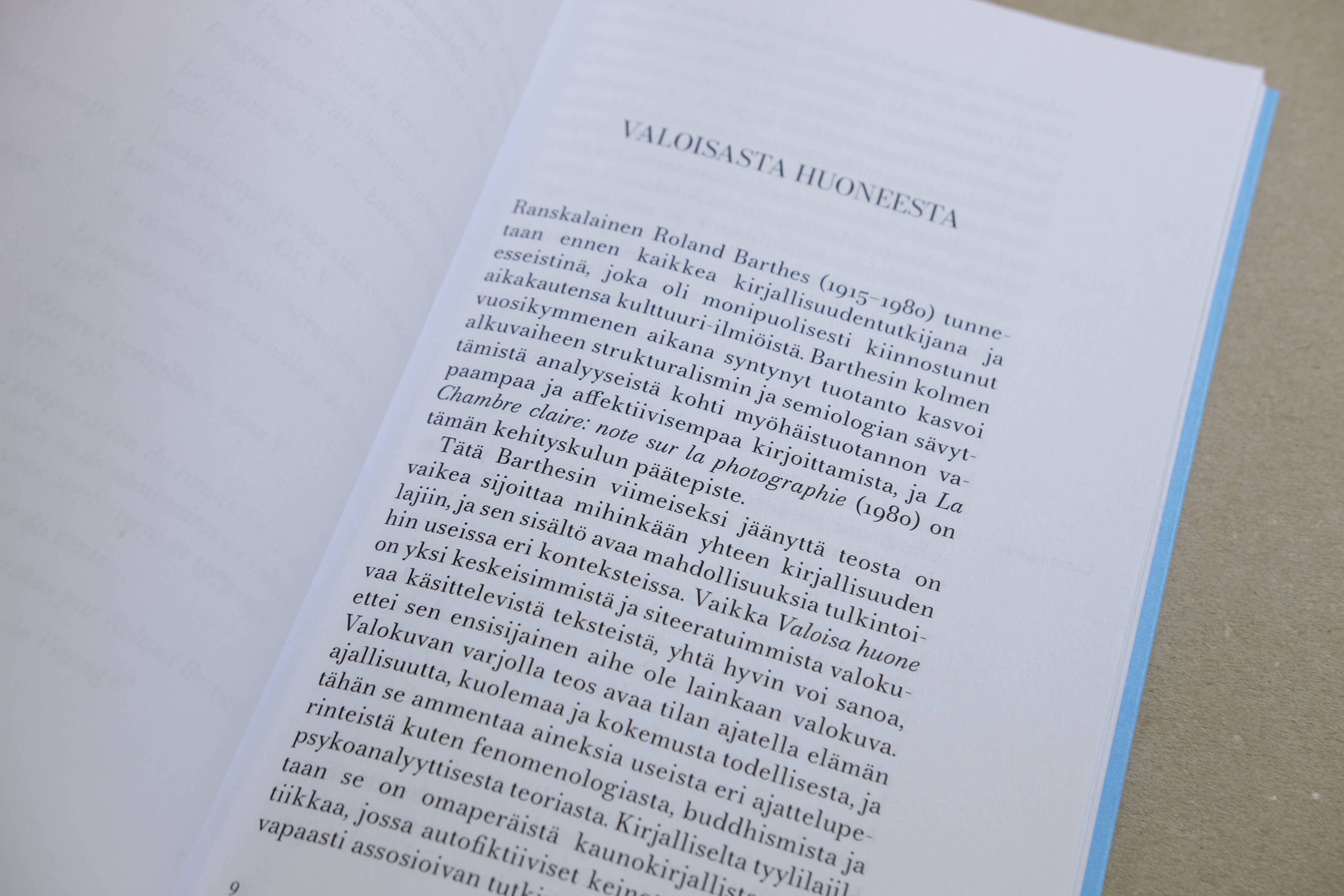 Roland Barthesin (1915–1980) Valoisa huone (1980) on pitkään ollut valokuvateorian ja -keskustelun vakituinen viittauskohta. Marjaana Kellan ja Hanna Weseliuksen uusi suomennos perustuu teoksesta viime vuosikymmeninä käytyyn vilkkaaseen keskusteluun.