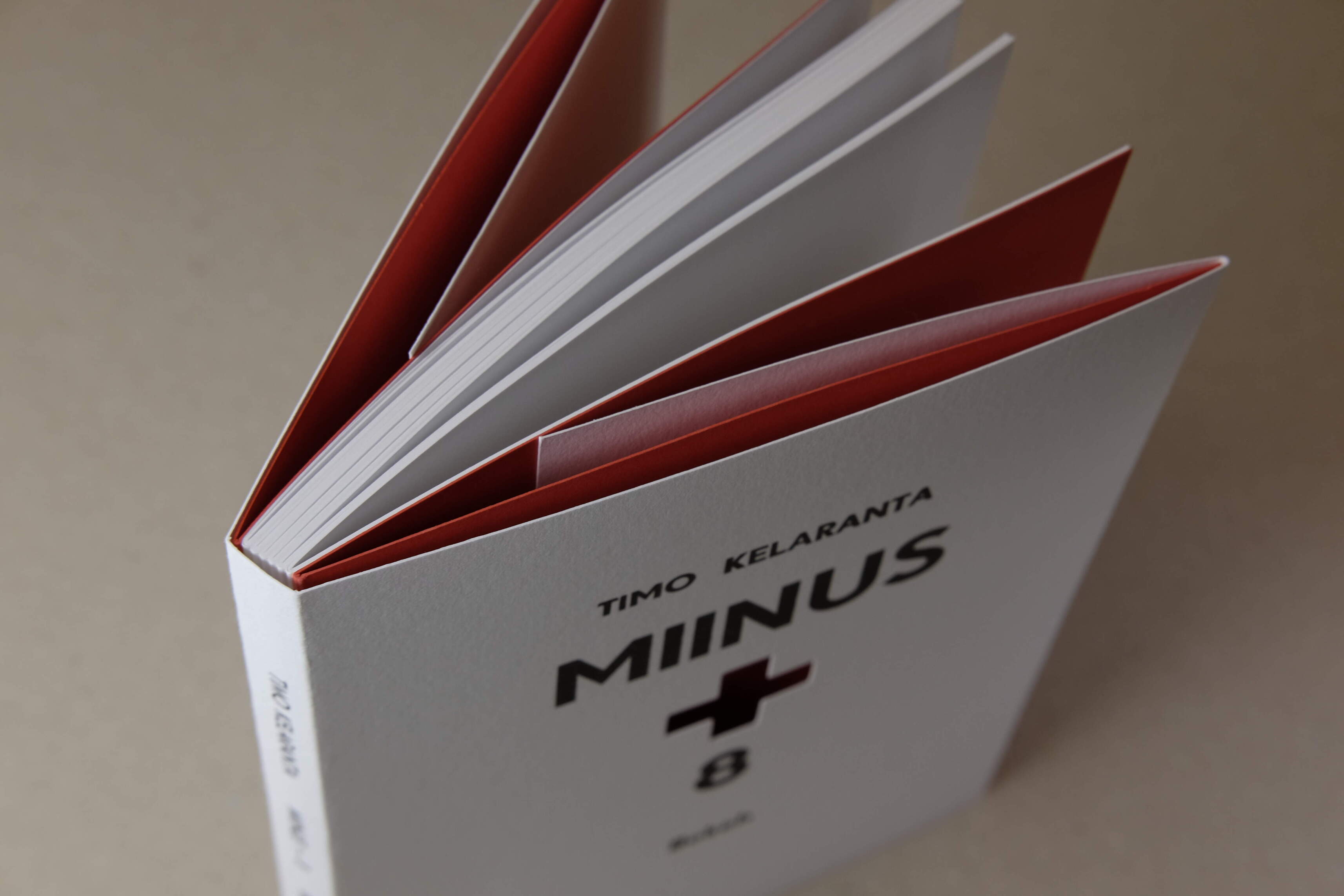 Miinus + 8:n kansikartonki on painettu Bokeh-pajalla Adana-kohopainokoneella. Itse kirja on painettu ja sidottu Jelgavassa Latviassa. Numeroitu editio 400 kappaletta.