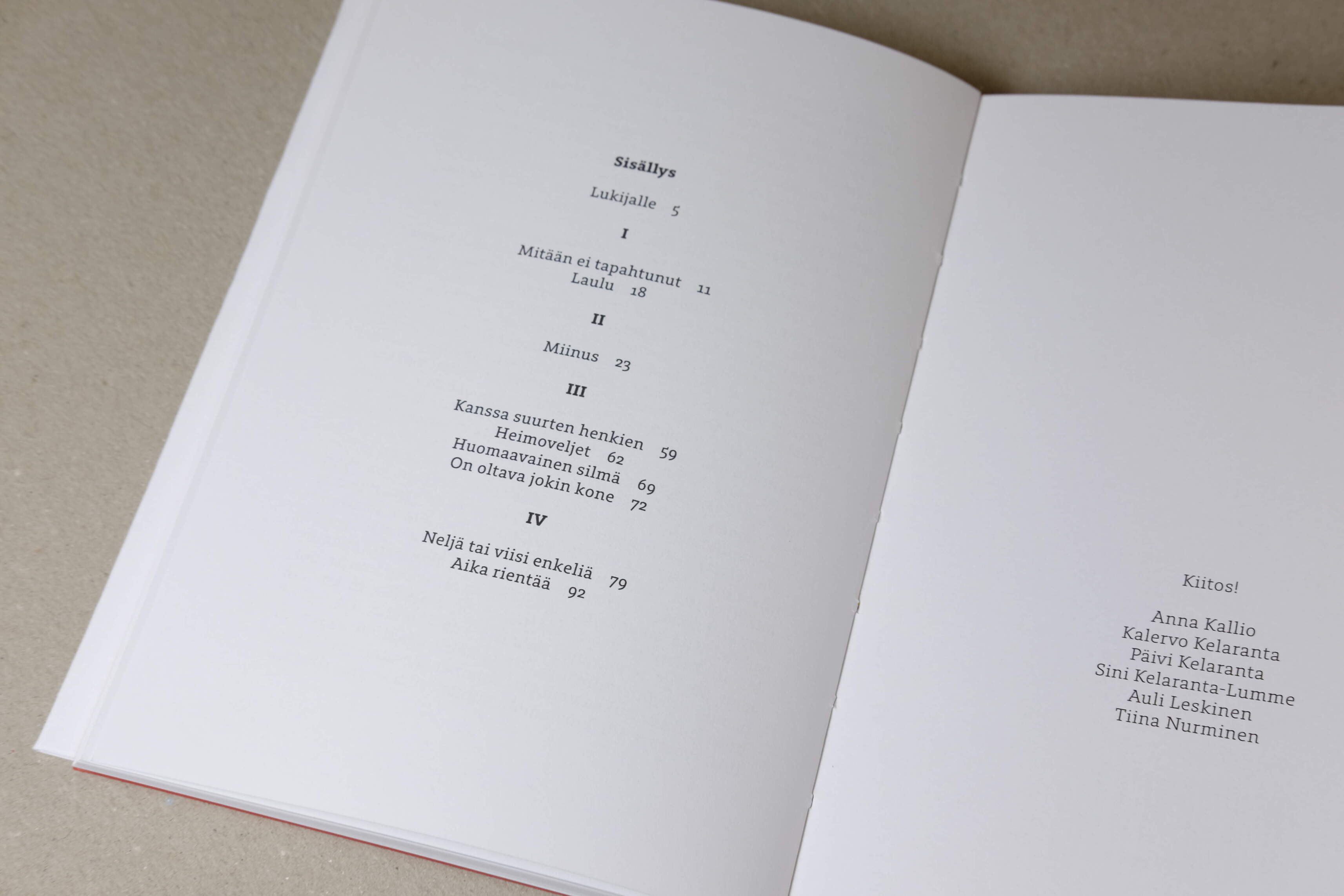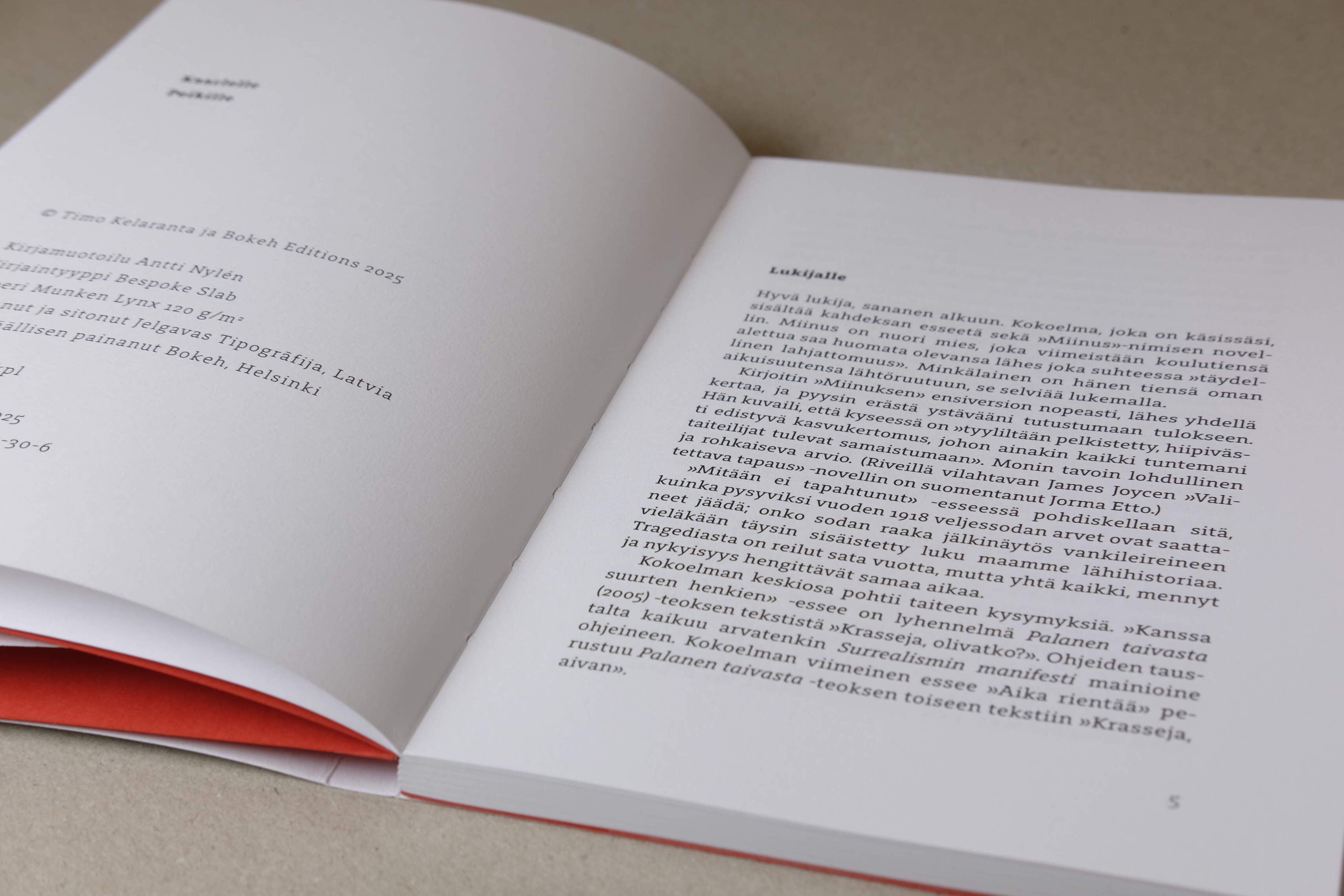 Muissa teksteissä Kelaranta käsittelee mm. Suomen sisällissodan perintöä, muutamia valokuvataiteilijoita sekä oman elämänsä hämmentäviä sattumuksia. Kertojanääni on Kelarannan aiemmasta 2222-esseekokoelmasta tuttu, terävä, asiallinen, tinkimätön, lämmin – ja oudon rauhoittava, vaikka aiheet ovat usein kohtalokkaita.