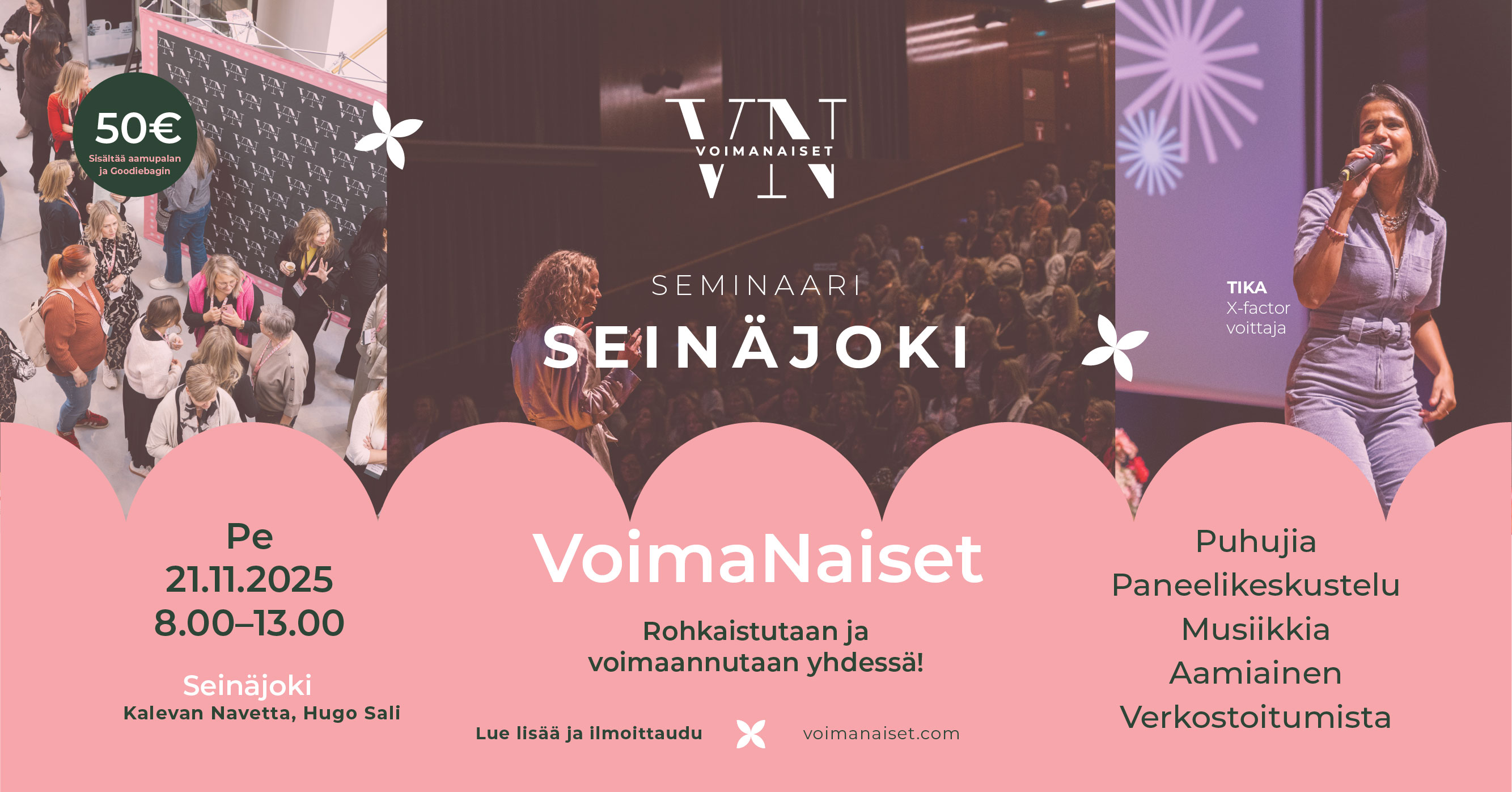 VoimaNaiset on viihdyttävä verkostoitumisseminaari. Tule mukaan voimaantumaan ja inspiroitumaan yhdessä upeiden naisten kanssa! Pääset nauttimaan musiikista ja inspiroitumaan puhujista.