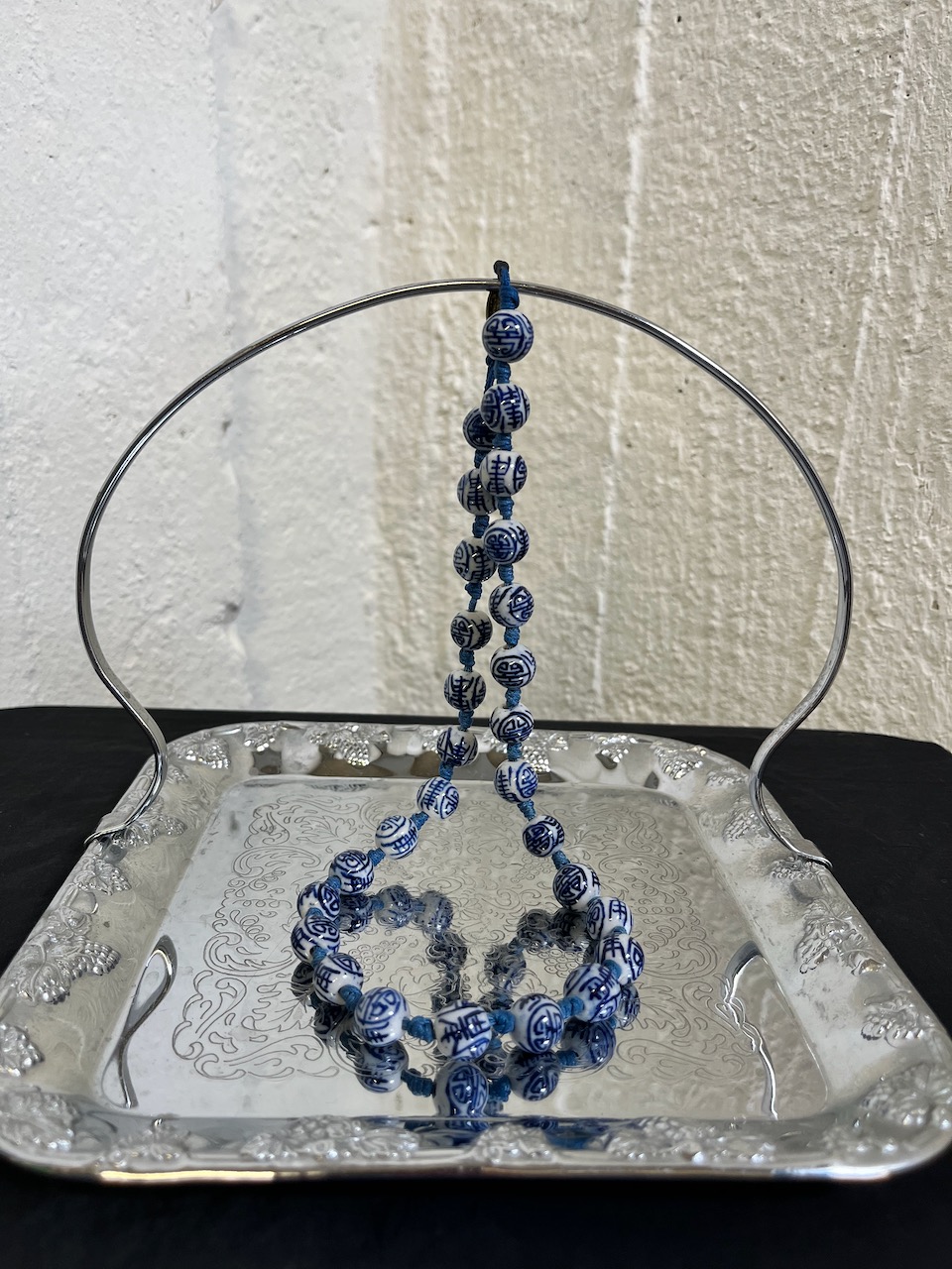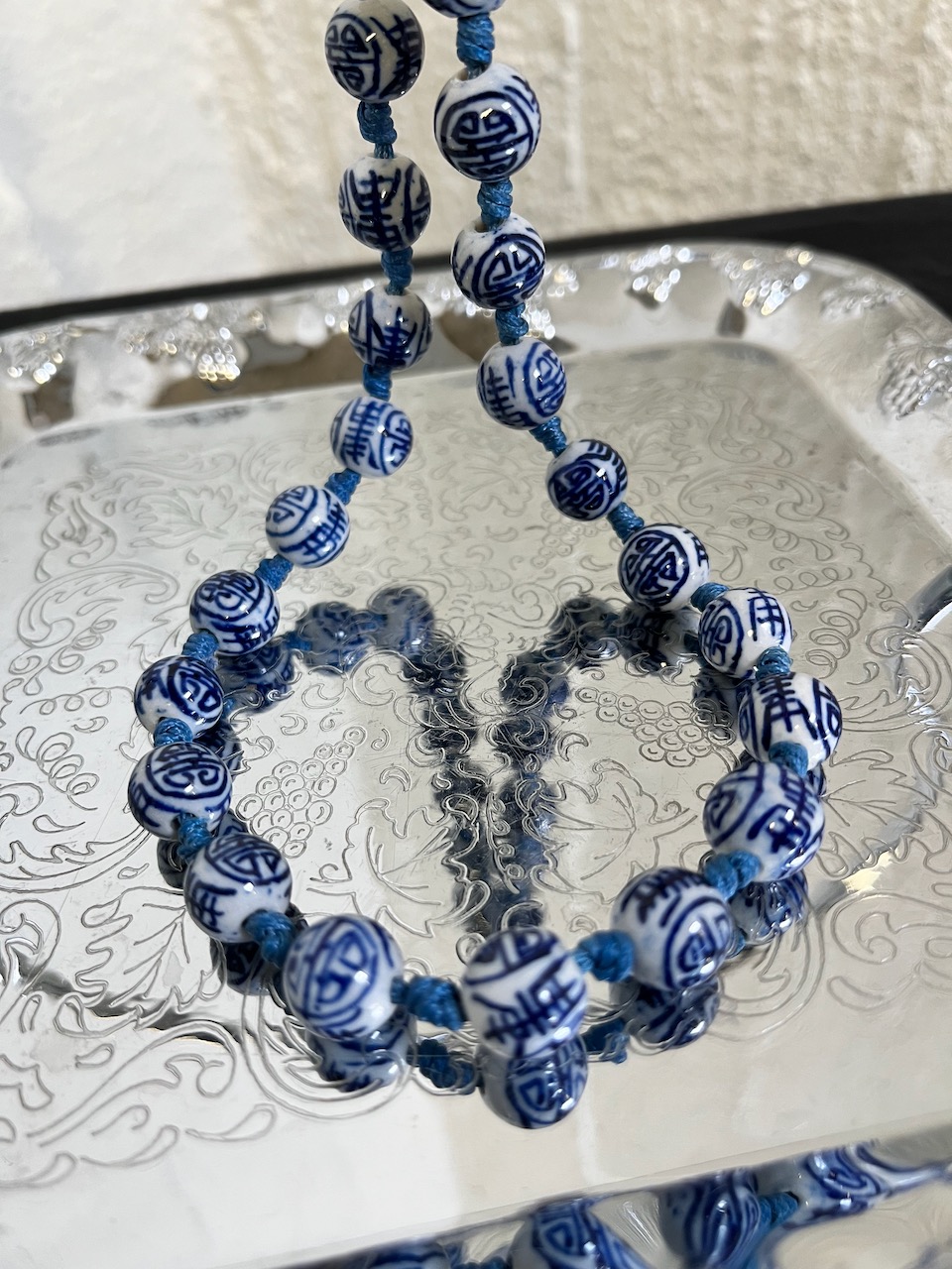 Nämä kauniit vintage helmet on valmistettu valkoisista posliini helmistä, jotka kuvioitu sinisellä.